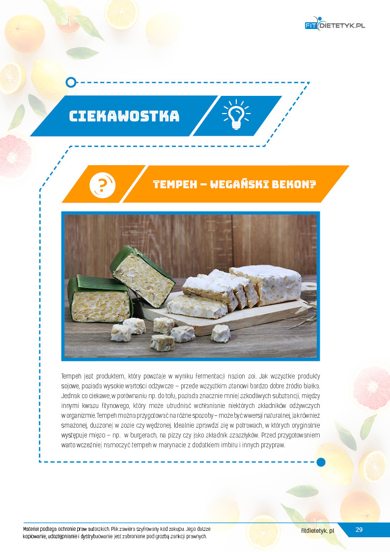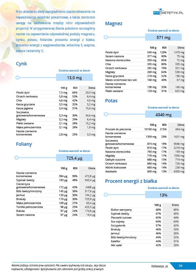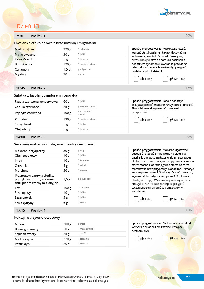 Kompleksowy, 30 dniowy program żywieniowy opracowany specjalnie z myślą o MĘŻCZYZNACH stosujących dietę WEGAŃSKĄ. W jadłospisie wykorzystano produkty wyłącznie pochodzenia roślinnego. Dieta ma charakter oczyszczający, rewitalizujący i wspomagający redukcję zbędnej masy ciała. Posiłki są bardzo różnorodne i urozmaicone, a jednocześnie dostarczają wszystkich składników odżywczych niezbędnych do prawidłowego funkcjonowania organizmu. W komponowaniu jadłospisu szczególny nacisk położono na zawartość białka, żelaza, wapnia oraz witamin z grupy B. Dodatkowo posiłki są ciekawe, niezwykle smaczne, a przy tym łatwe w przygotowaniu. Dzięki temu dieta sprawdzi się zarówno u tych kobiet, które stosują dietę roślinną już od jakiegoś czasu i szukają nowych kuchennych inspiracji, jak i u tych, które dopiero zaczynają swoją przygodę z weganizmem.
