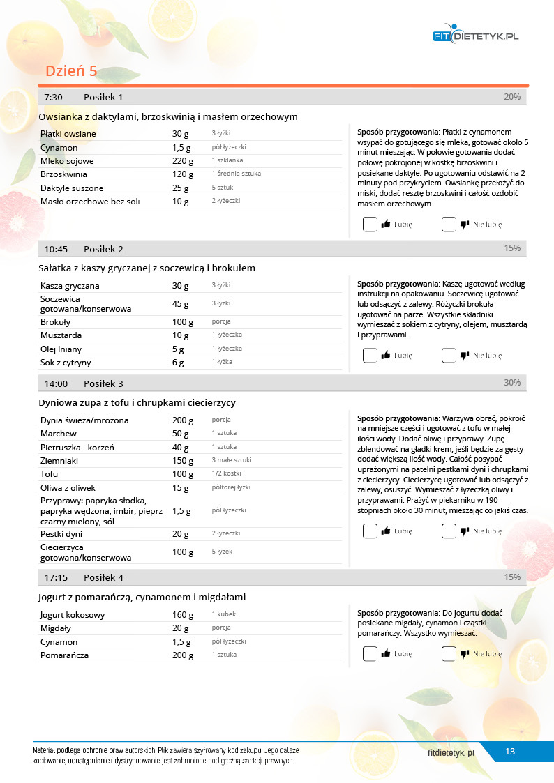 w formie propozycji posiłków (zamiast pojedynczych jadłospisów jednodniowych, przygotowano propozycje kilku propozycji dań na każdy posiłek). Tutaj nie uzależniamy Cię od tego jakie masz np. w danym dniu zjeść śniadanie czy obiad, tylko sam wybierasz sobie ulubione danie z kilku przedstawionych przez nas propozycji.