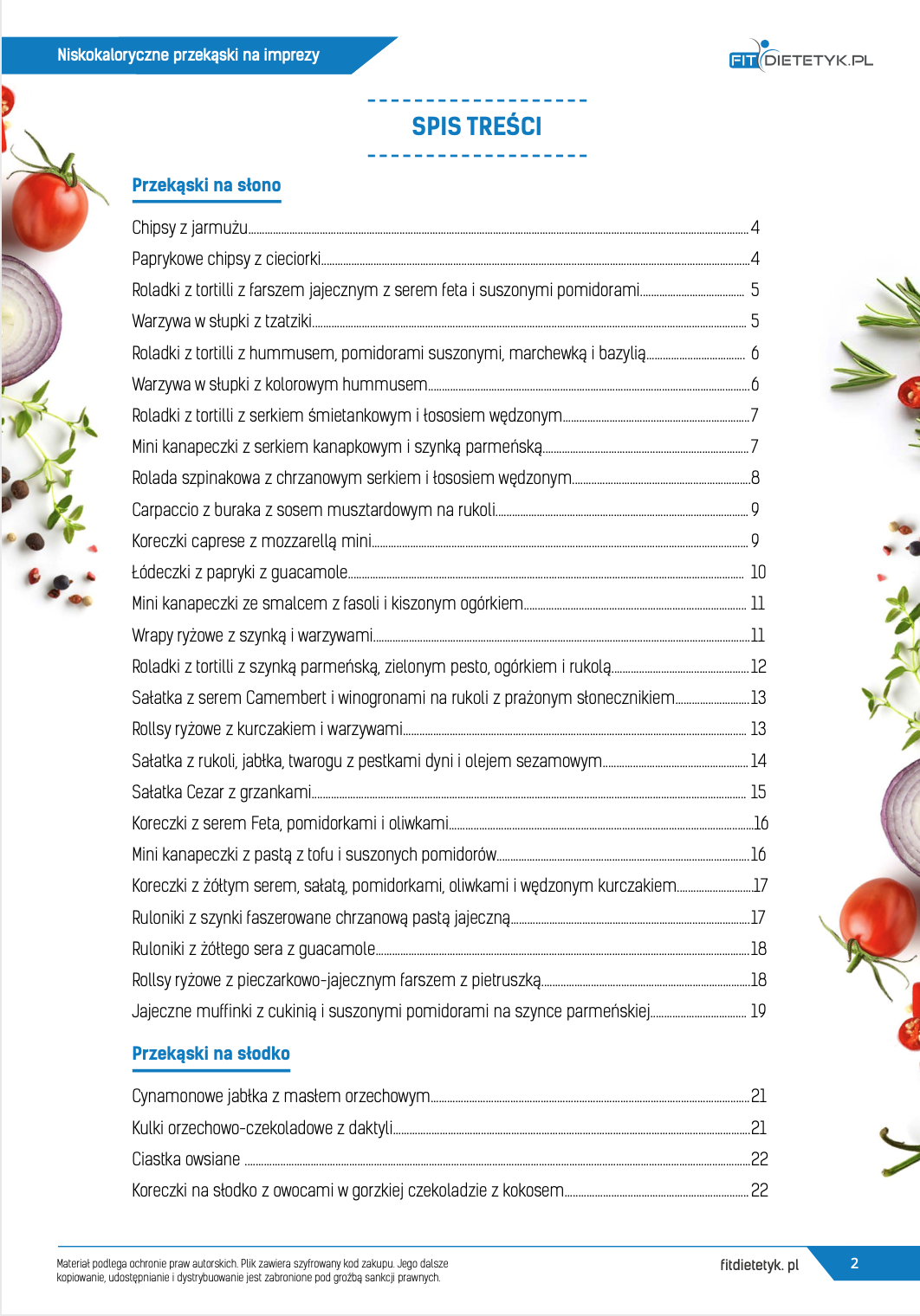 Brakuje Ci pomysłu na pyszne a zarazem dietetyczne przekąski? W tym e-booku znajdziesz ponad 30 różnych przekąsek przygotowanych na różne imprezy okolicznościowe. Przygotowano tutaj zarówno przekąski na słono jak również na słodko. Zaskocz swoich znajomych lub rodzinę i pokaż, że przekąska może być nie tylko smaczna ale także niskokaloryczna i zdrowa.