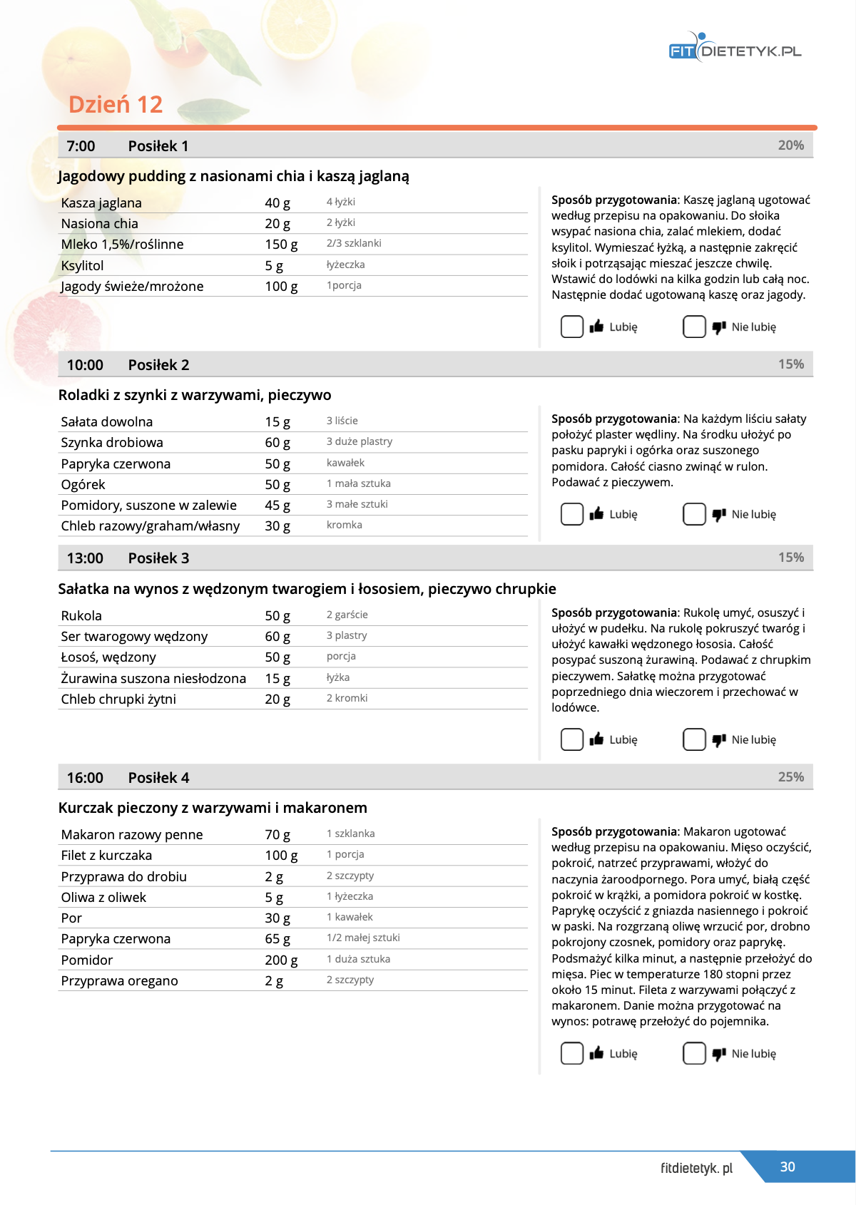 w formie precyzyjnych jadłospisów wielodniowych (na każdy dzień miesiąca jest opracowany osobny jadłospis). Tutaj nie musisz zastanawiać się co zjeść każdego dnia, gdyż będziesz mieć dokładnie wszystko rozplanowane.