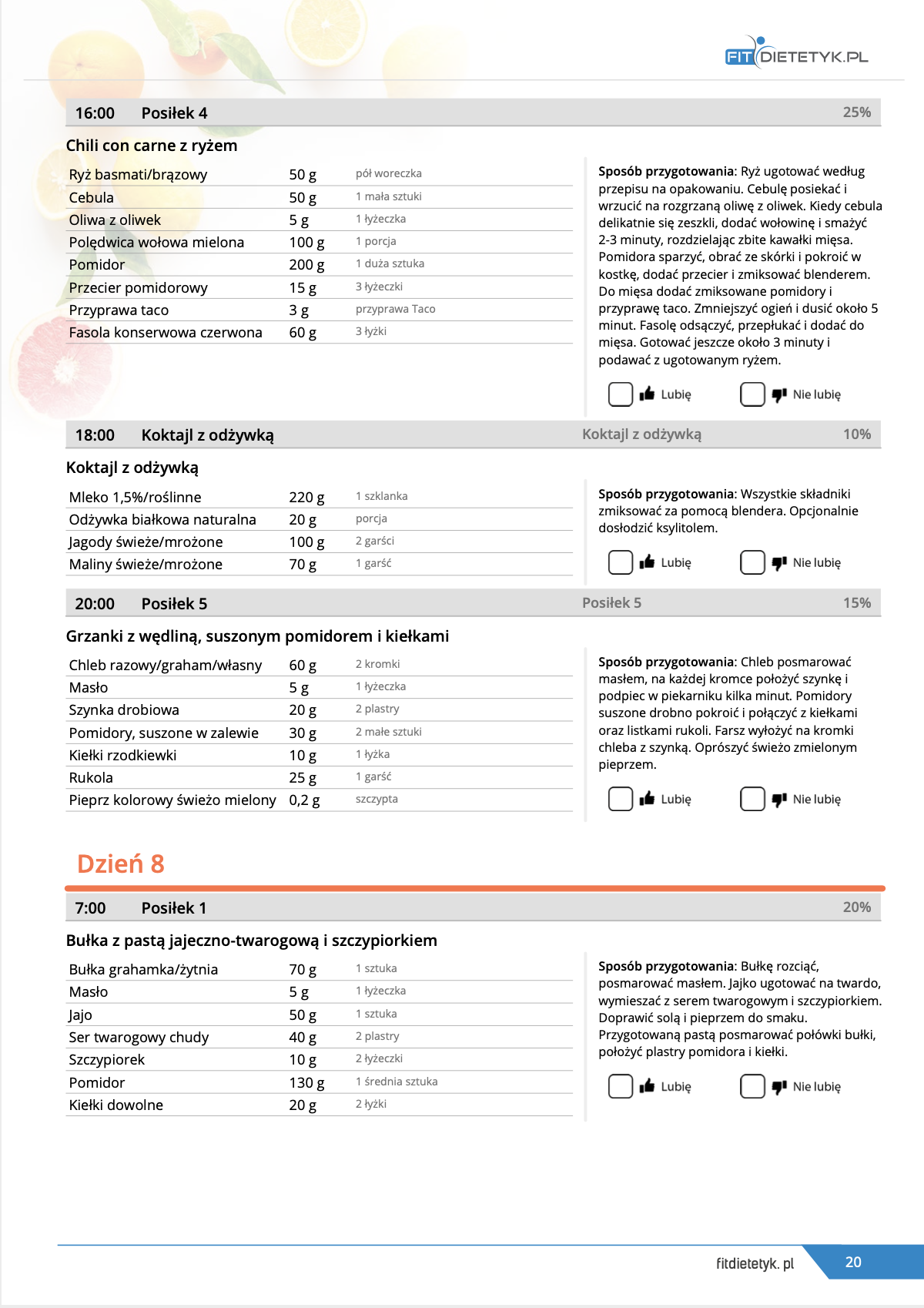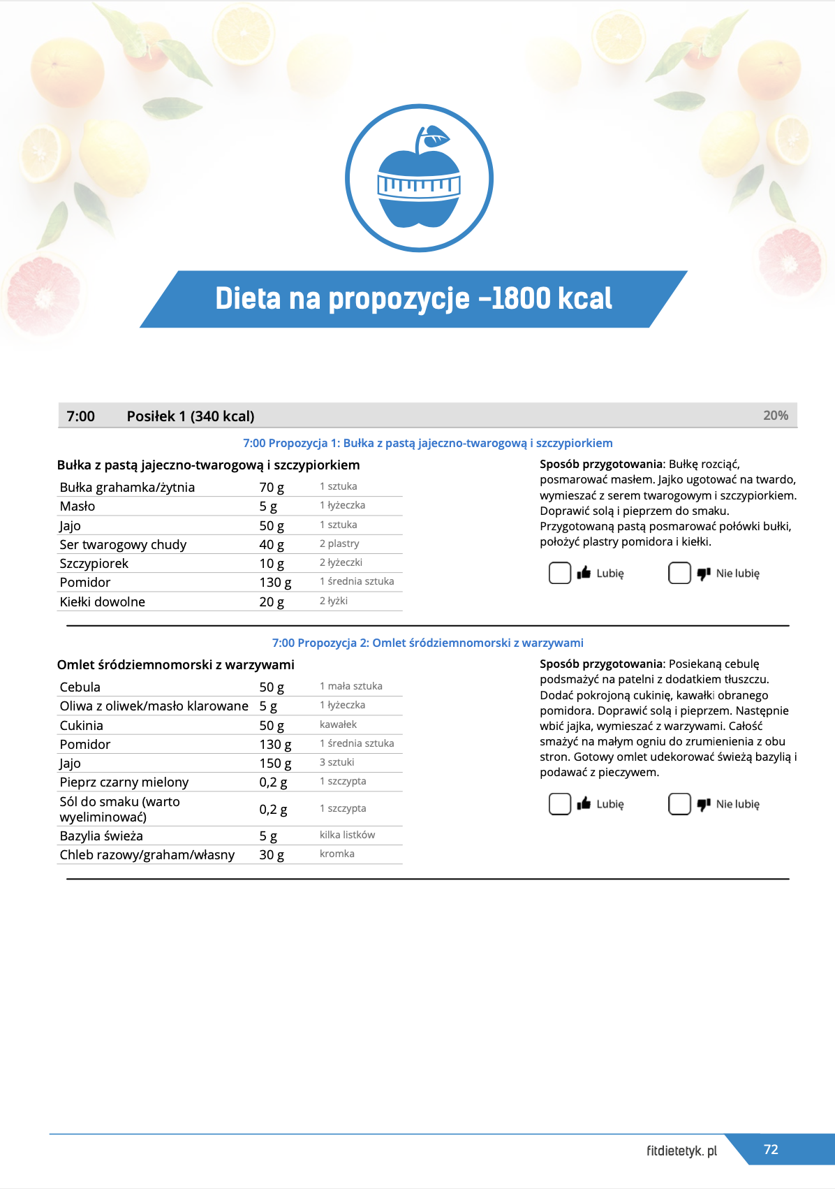 w formie propozycji posiłków (zamiast pojedynczych jadłospisów jednodniowych, przygotowano propozycje kilku propozycji dań na każdy posiłek). Tutaj nie uzależniamy Cię od tego jakie masz np. w danym dniu zjeść śniadanie czy obiad, tylko sam wybierasz sobie ulubione danie z kilku przedstawionych przez nas propozycji.