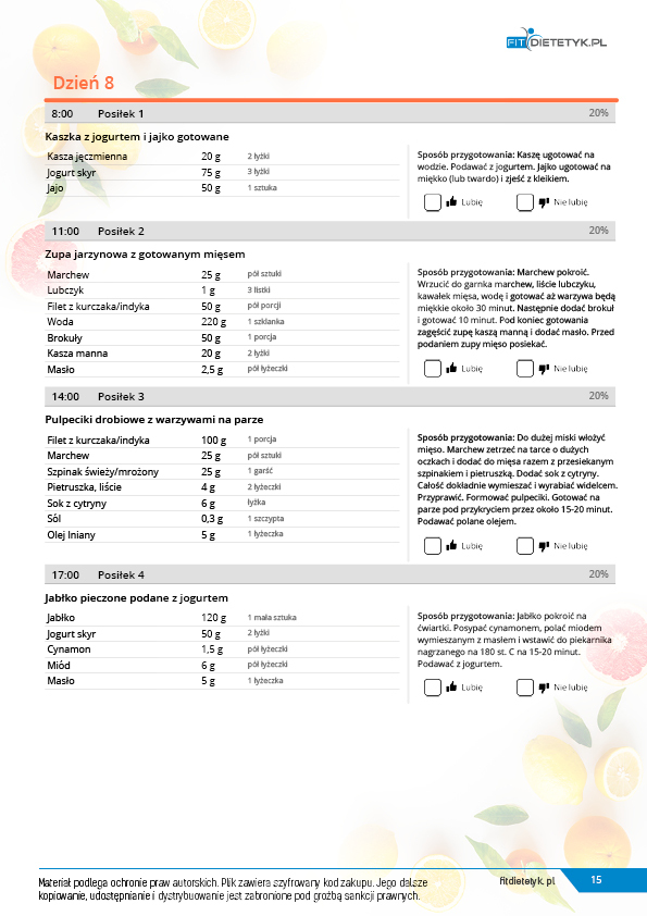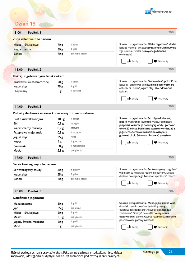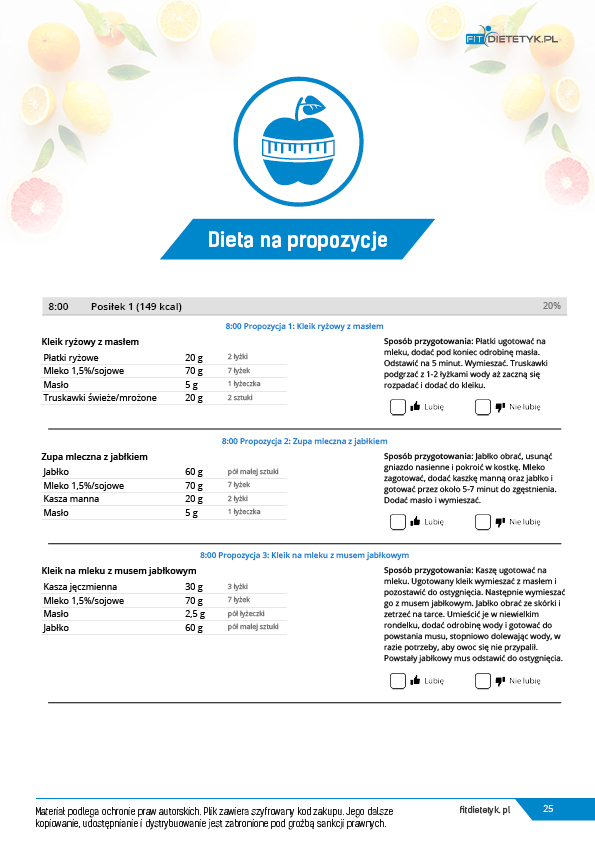 w formie propozycji posiłków (zamiast pojedynczych jadłospisów jednodniowych, przygotowano propozycje kilku propozycji dań na każdy posiłek). Tutaj nie uzależniamy Cię od tego jakie masz np. w danym dniu zjeść śniadanie czy obiad, tylko sam wybierasz sobie ulubione danie z kilku przedstawionych przez nas propozycji.