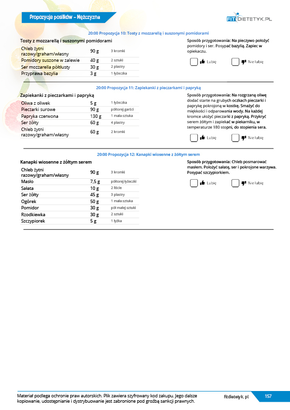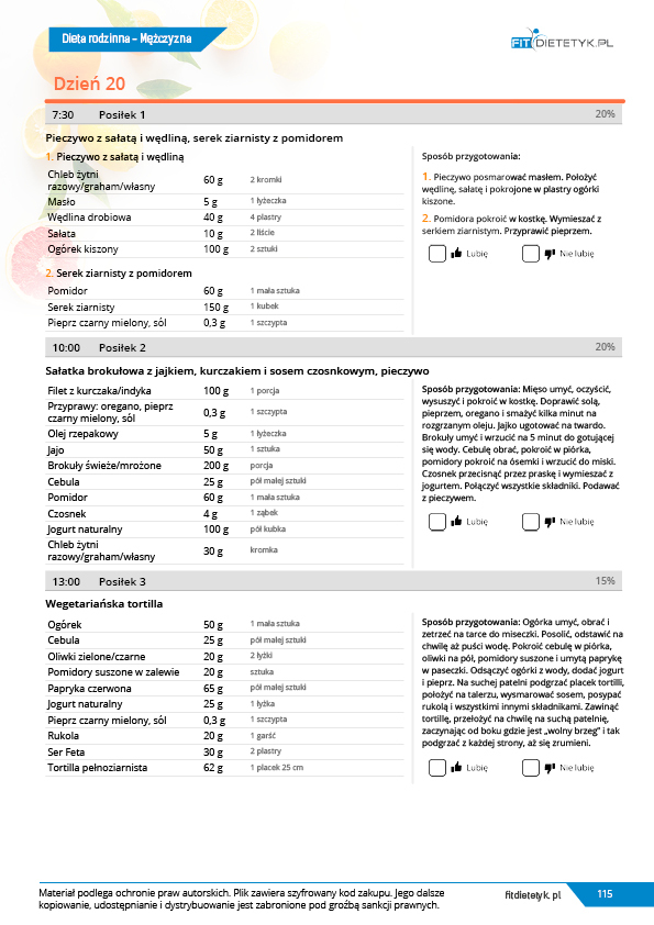 w formie propozycji posiłków (zamiast pojedynczych jadłospisów jednodniowych, przygotowano propozycje kilku propozycji dań na każdy posiłek). Tutaj nie uzależniamy Cię od tego jakie masz np. w danym dniu zjeść śniadanie czy obiad, tylko sam wybierasz sobie ulubione danie z kilku przedstawionych przez nas propozycji.