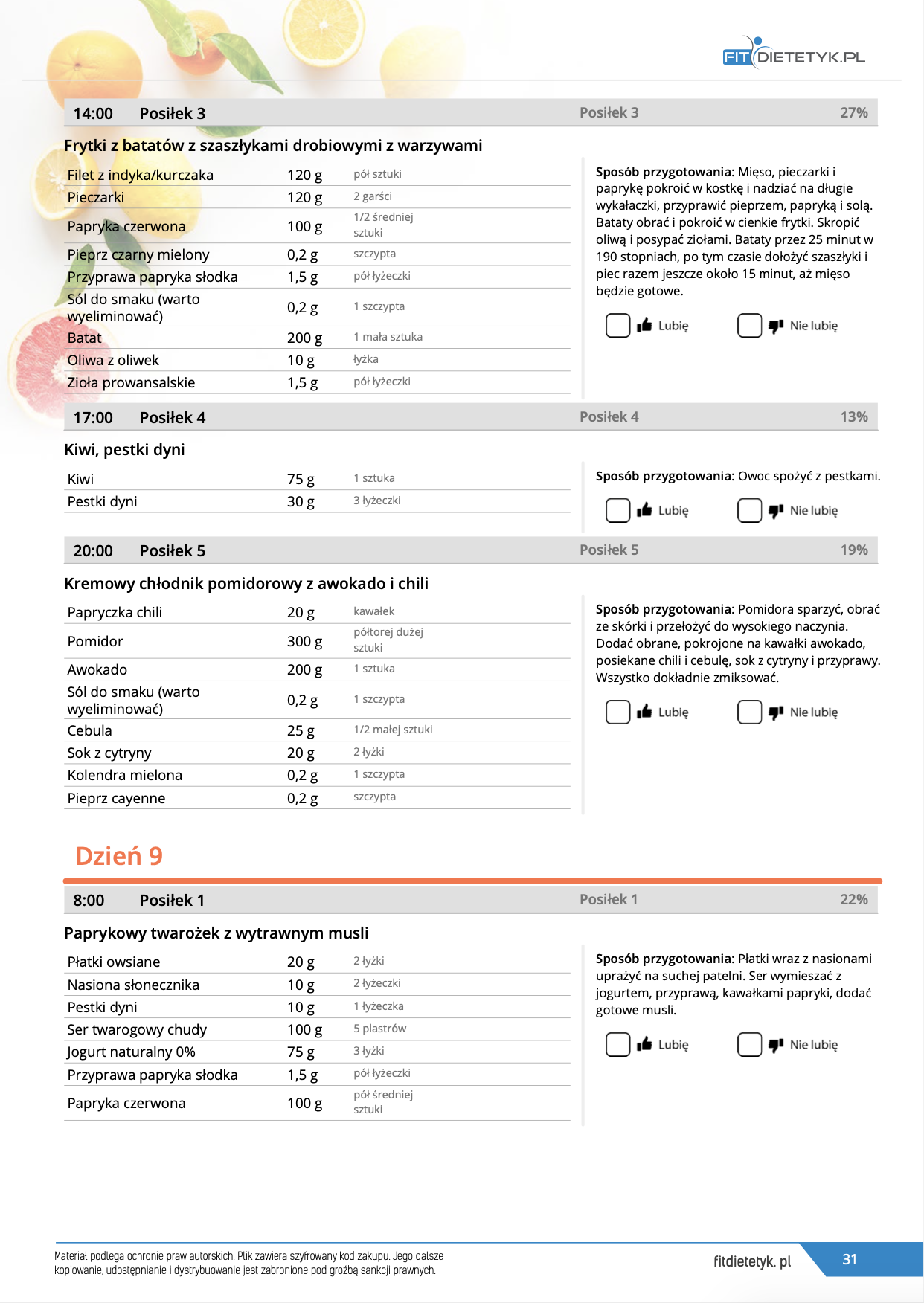 w formie propozycji posiłków (zamiast pojedynczych jadłospisów jednodniowych, przygotowano propozycje kilku propozycji dań na każdy posiłek). Tutaj nie uzależniamy Cię od tego jakie masz np. w danym dniu zjeść śniadanie czy obiad, tylko sam wybierasz sobie ulubione danie z kilku przedstawionych przez nas propozycji.