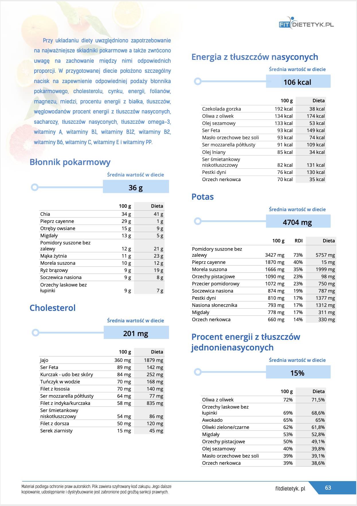 Dodatkowo do opracowanego planu dietetycznego otrzymasz atrakcyjnie przygotowane ciekawostki i wiadomości żywieniowe, które mam nadzieję pozwolą Ci zrozumieć wiele spraw związanych z nurtującym Cię problemem, a także przyczynią się do zwiększenia ogólnej wiedzy żywieniowej.