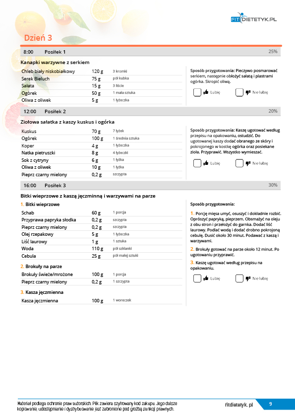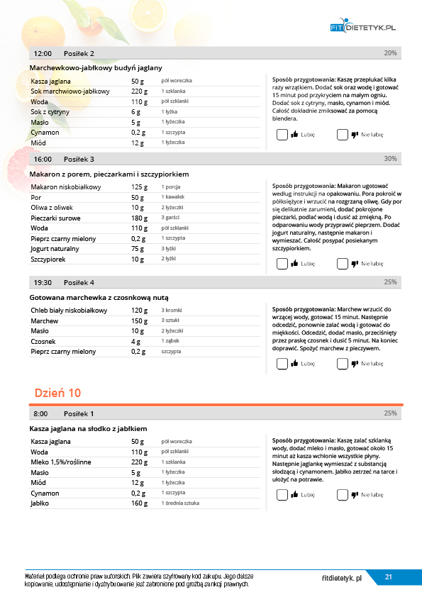 w formie propozycji posiłków (zamiast pojedynczych jadłospisów jednodniowych, przygotowano propozycje kilku propozycji dań na każdy posiłek). Tutaj nie uzależniamy Cię od tego jakie masz np. w danym dniu zjeść śniadanie czy obiad, tylko sam wybierasz sobie ulubione danie z kilku przedstawionych przez nas propozycji.