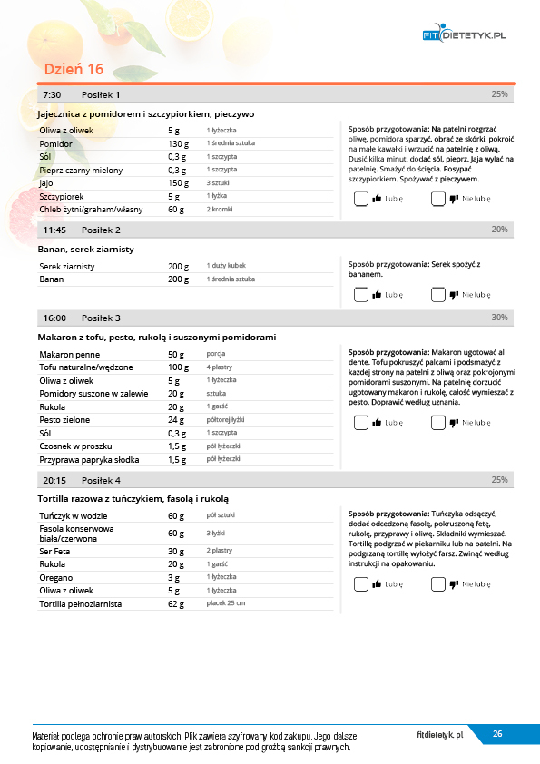 w formie propozycji posiłków (zamiast pojedynczych jadłospisów jednodniowych, przygotowano propozycje kilku propozycji dań na każdy posiłek). Tutaj nie uzależniamy Cię od tego jakie masz np. w danym dniu zjeść śniadanie czy obiad, tylko sam wybierasz sobie ulubione danie z kilku przedstawionych przez nas propozycji.