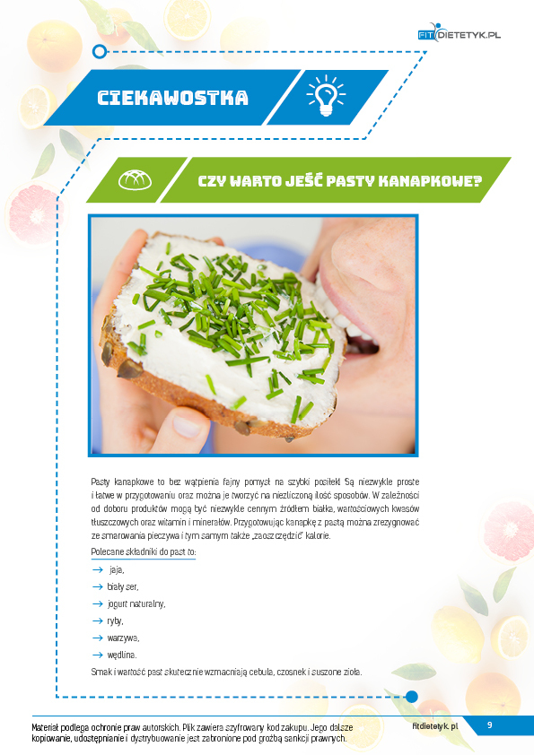 Dodatkowo do opracowanego planu dietetycznego otrzymasz atrakcyjnie przygotowane ciekawostki i wiadomości żywieniowe, które mam nadzieję pozwolą Ci zrozumieć wiele spraw związanych z nurtującym Cię problemem, a także przyczynią się do zwiększenia ogólnej wiedzy żywieniowej.