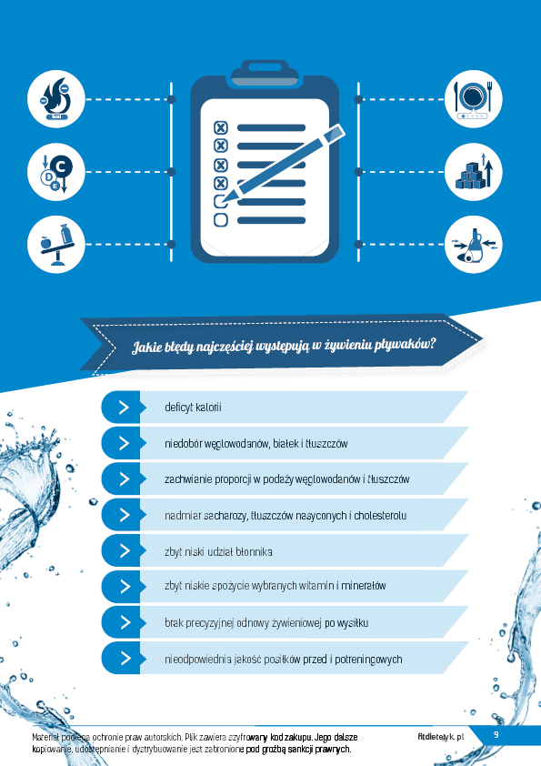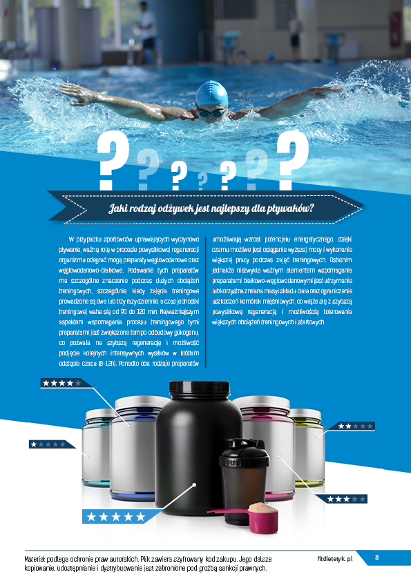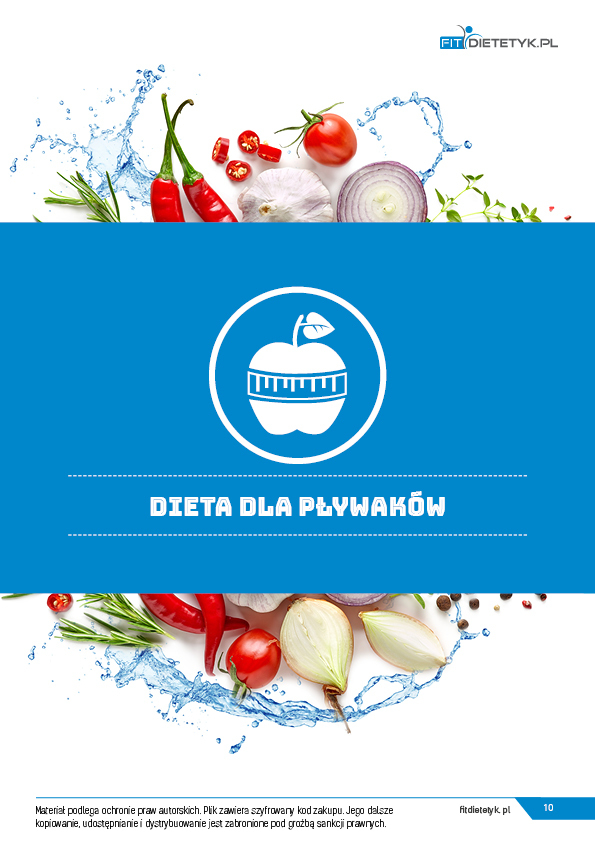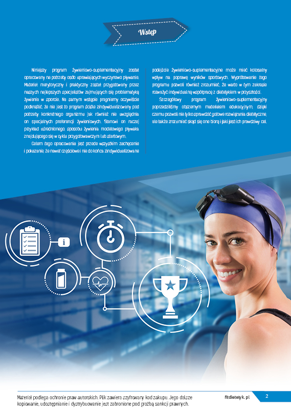 Kompleksowy program żywieniowy dla osób trenujących pływanie zawodowo lub amatorsko. Jadłospis na 30 dni został skomponowany z myślą o pływakach, tak, by wspomóc osiągnięcia sportowe i regenerację organizmu. Pierwsze posiłki w ciągu dnia doskonale sprawdzą się jako posiłek przedtreningowy (koktajle, kasze z owocami, owsianki i omlety), kolejne dania to łatwe do zabrania na wynos potrawy (kanapki, placuszki, naleśniki, jogurty). Dodatkowo jeden z 6 posiłków to naturalny, domowy izotonik przeznaczony do spożycia w trakcie treningu. Kolejność posiłków można zmieniać dowolnie tak, by dopasować w razie potrzeby do rozkładu jednostek treningowych w ciągu dnia.