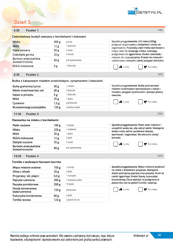 w formie precyzyjnych jadłospisów wielodniowych (na każdy dzień miesiąca jest opracowany osobny jadłospis). Tutaj nie musisz zastanawiać się co zjeść każdego dnia, gdyż będziesz mieć dokładnie wszystko rozplanowane.