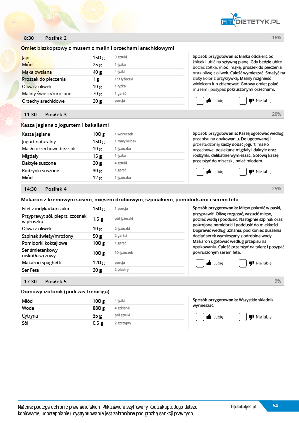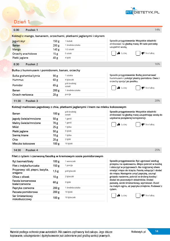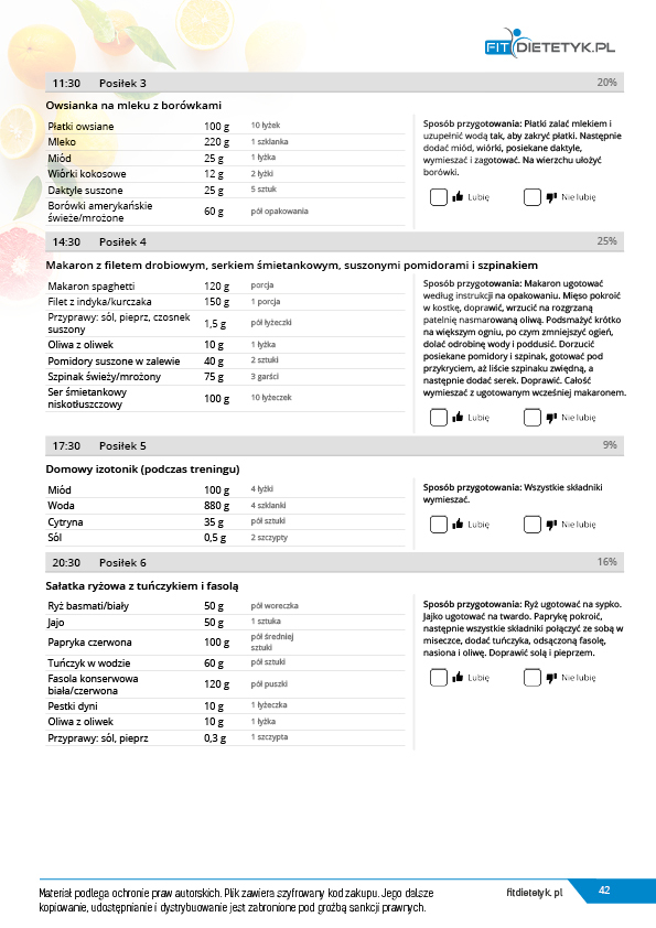 w formie propozycji posiłków (zamiast pojedynczych jadłospisów jednodniowych, przygotowano propozycje kilku propozycji dań na każdy posiłek). Tutaj nie uzależniamy Cię od tego jakie masz np. w danym dniu zjeść śniadanie czy obiad, tylko sam wybierasz sobie ulubione danie z kilku przedstawionych przez nas propozycji.