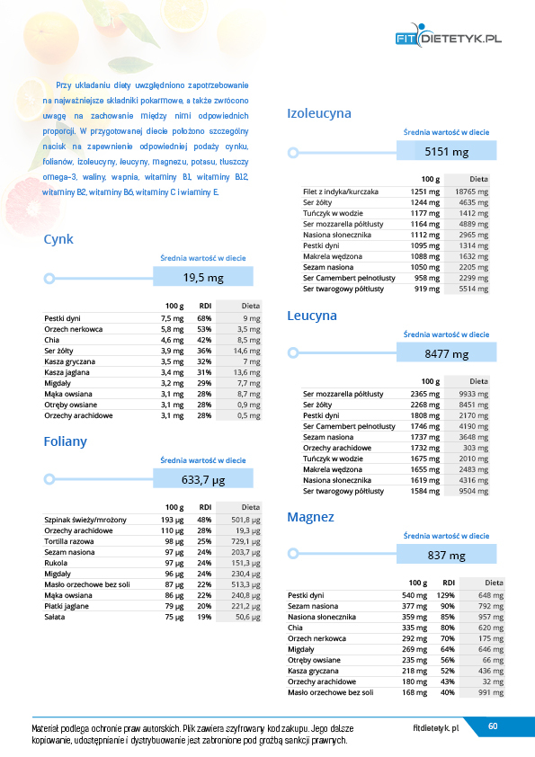 Dieta zawiera odpowiednią ilość pełnowartościowego białka oraz węglowodanów prostych i złożonych, niezbędnych do prawidłowej regeneracji organizmu oraz rekompensacji glikogenu, nawet przy dwóch jednostkach treningowych na dobę. Zwrócono także uwagę na zawartość elektrolitów, witamin z grupy B, witamin antyoksydacyjnych i przeciwzapalnych kwasów tłuszczowych omega-3. Dieta ta nie tylko odpowiednio odżywi organizm sportowca, ale także będzie ciekawą inspiracją na proste i smaczne dania o wysokiej gęstości odżywczej.