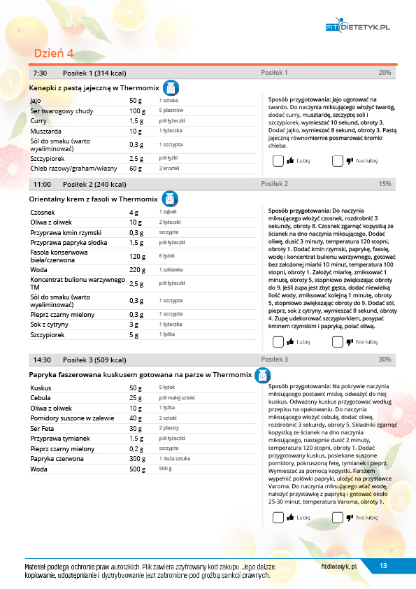 Kompleksowy, 30 dniowy program dietetyczny dla WEGETARIAN z przewagą dań na THERMOMIX. Jadłospis oparto o produkty pochodzenia roślinnego z niewielkim dodatkiem produktów mlecznych i jaj. Dieta została skomponowana przez zespół dietetyków specjalizujących się w tematyce diety wegetariańskiej. Ta bardzo urozmaicona, niezwykle pożywna i wyjątkowo smaczna dieta zadowoli każdego, kto szuka zdrowych i wartościowych dań wegetariańskich. Pod względem odżywczym w diecie położono w szczególności nacisk na podaż takich składników jak białko, żelazo, witaminy grupy B oraz wiele minerałów których często brakuje w dietach roślinnych. Dieta idealnie nadaje się dla osób, chcących też spróbować takiego modelu żywienia.