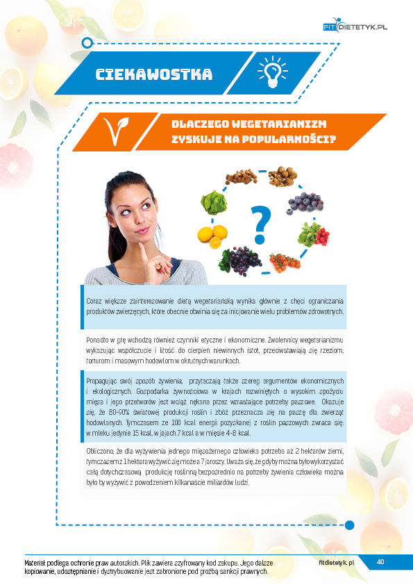 Dodatkowo do opracowanego planu dietetycznego otrzymasz atrakcyjnie przygotowane ciekawostki i wiadomości żywieniowe, które mam nadzieję pozwolą Ci zrozumieć wiele spraw związanych z nurtującym Cię problemem, a także przyczynią się do zwiększenia ogólnej wiedzy żywieniowej.