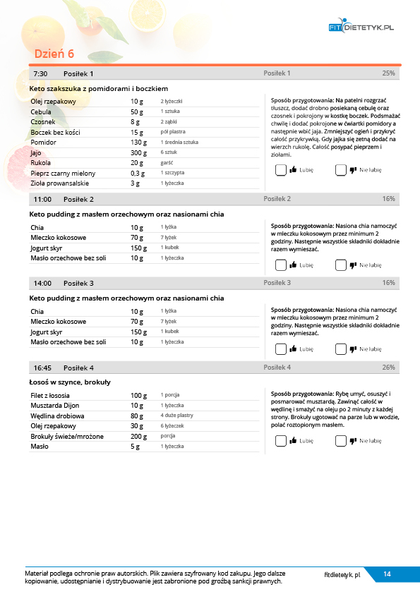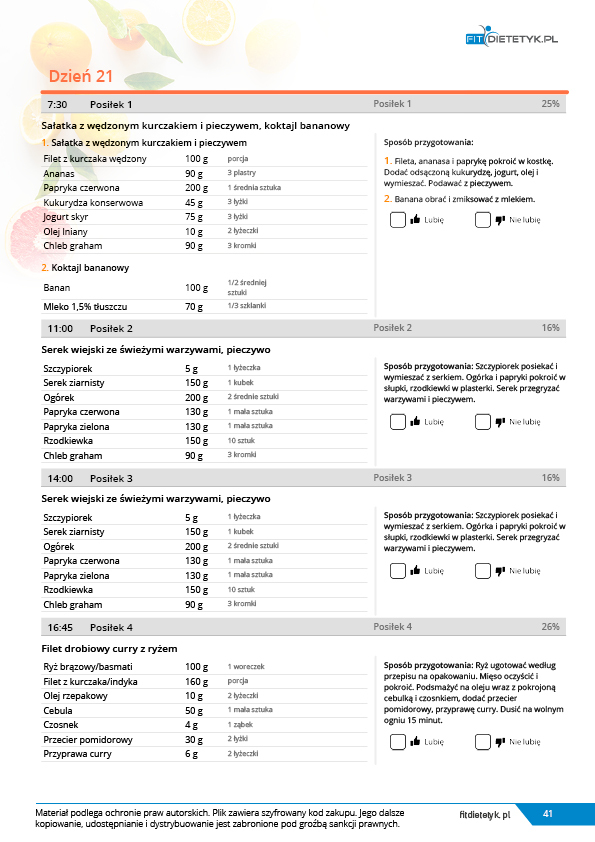 w formie propozycji posiłków (zamiast pojedynczych jadłospisów jednodniowych, przygotowano propozycje kilku propozycji dań na każdy posiłek). Tutaj nie uzależniamy Cię od tego jakie masz np. w danym dniu zjeść śniadanie czy obiad, tylko sam wybierasz sobie ulubione danie z kilku przedstawionych przez nas propozycji.