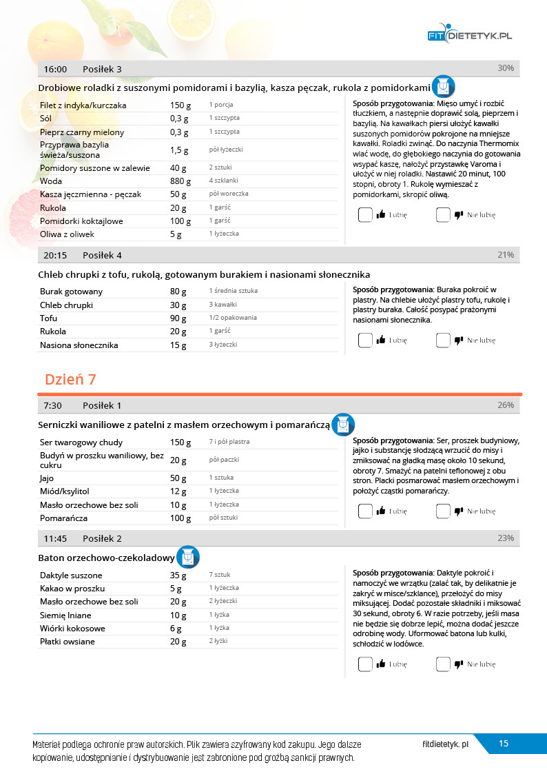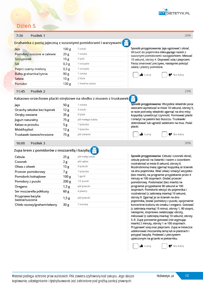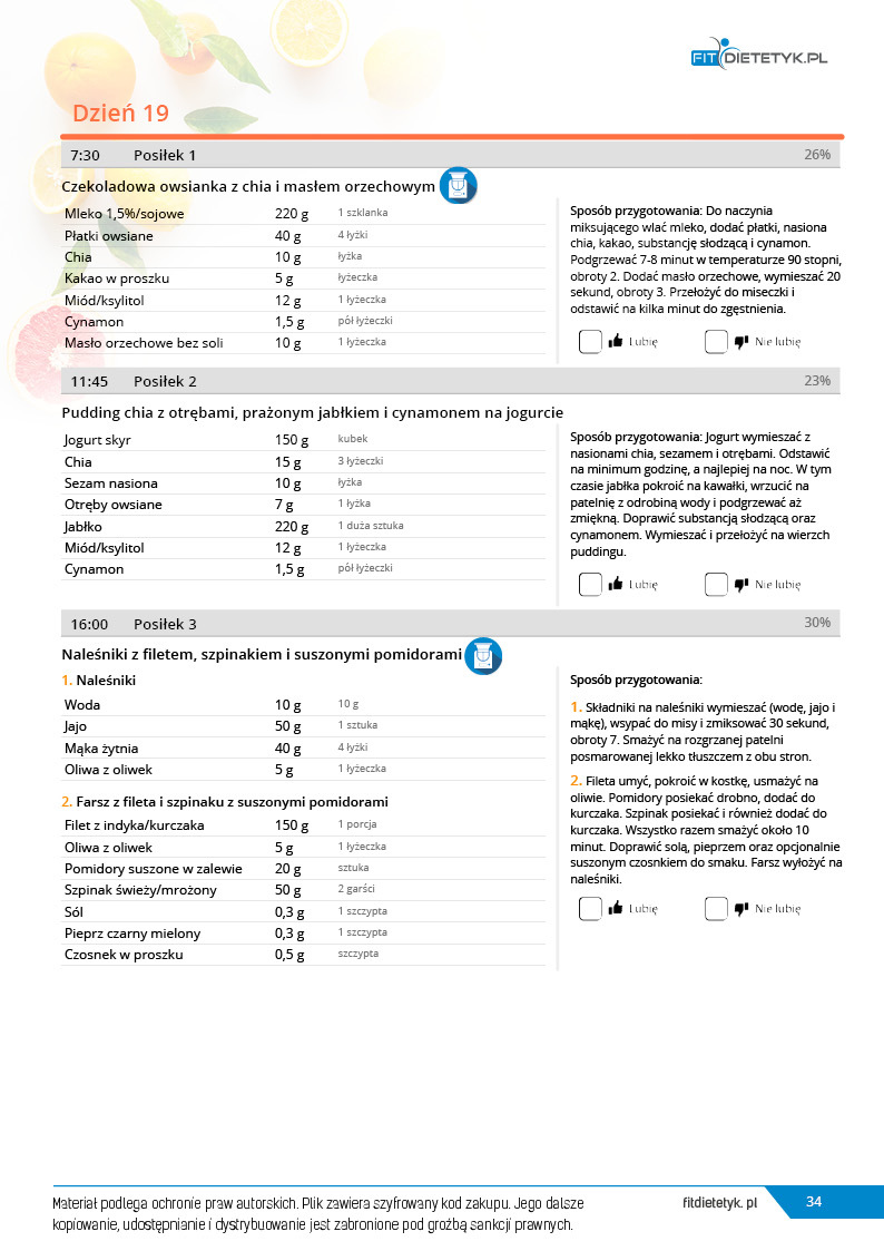 w formie propozycji posiłków (zamiast pojedynczych jadłospisów jednodniowych, przygotowano propozycje kilku propozycji dań na każdy posiłek). Tutaj nie uzależniamy Cię od tego jakie masz np. w danym dniu zjeść śniadanie czy obiad, tylko sam wybierasz sobie ulubione danie z kilku przedstawionych przez nas propozycji.