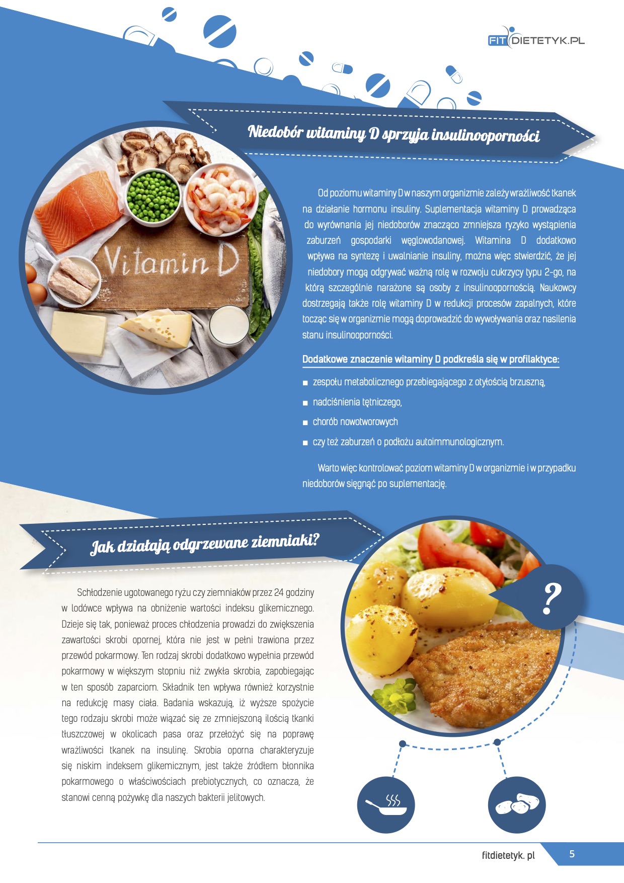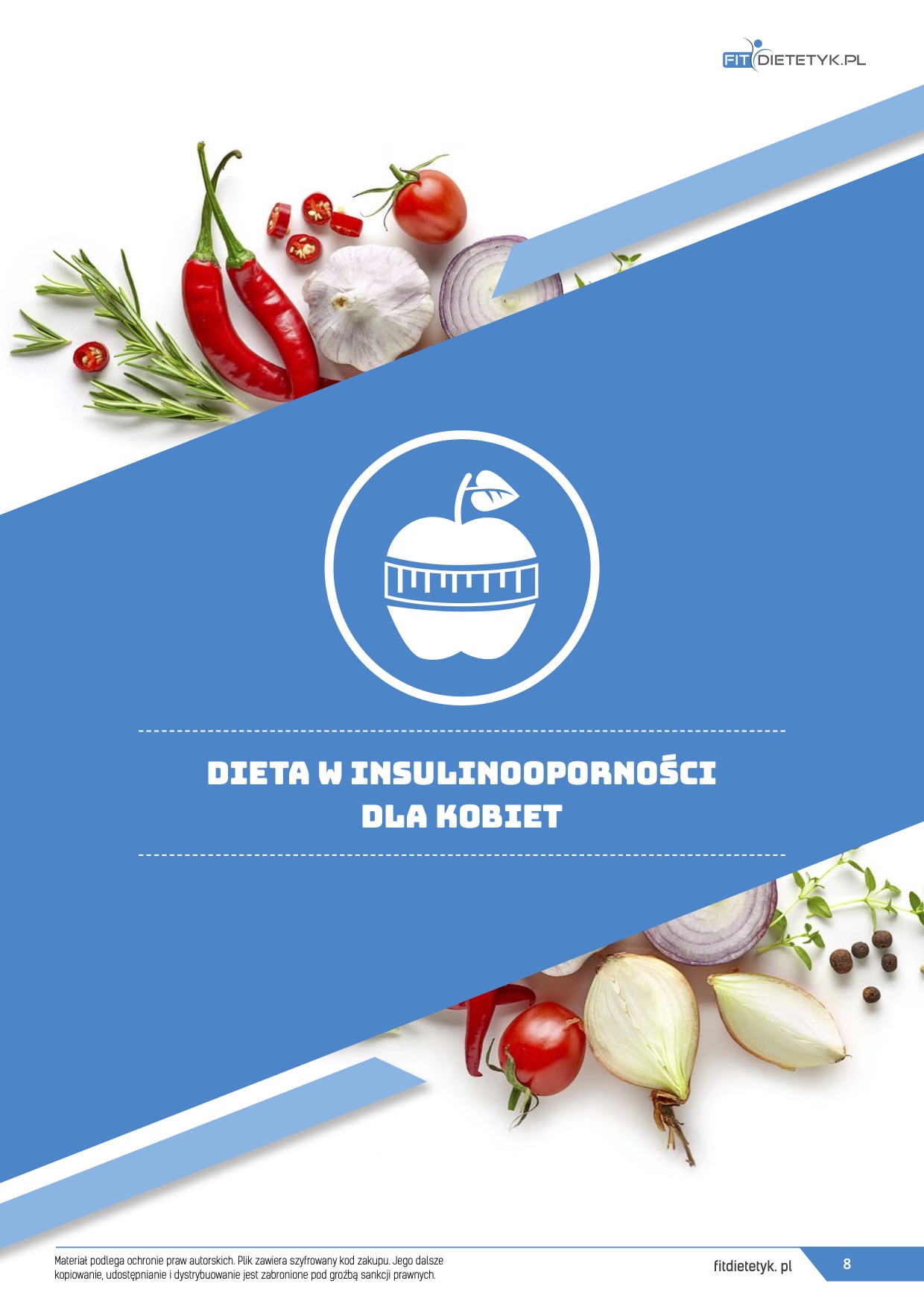 Kompleksowy program żywieniowy dla KOBIET z zaburzeniami gospodarki węglowodanowej, takimi jak: insulinooporność oraz hiperinsulinemia. Jadłospis na 30 dni został opracowany tak, by wspomagać redukcję masy ciała oraz regulację poziomu glukozy i insuliny we krwi. Dieta została skomponowana o zasady niskiego ładunku glikemicznego z ograniczeniem podaży cukrów prostych. Zwrócono także uwagę na zawartość najważniejszych przy zaburzeniach gospodarki węglowodanów składników, takich jak: witaminy z grupy B, magnez, kwasy tłuszczowe omega-3 oraz błonnik pokarmowy. Zachowane zostały odpowiednie dla zachowania zdrowia proporcje kwasów tłuszczowych. Dieta sprawdzi się także idealnie u kobiet, u których stwierdzono hipoglikemię reaktywną lub stan przedcukrzycowy.
