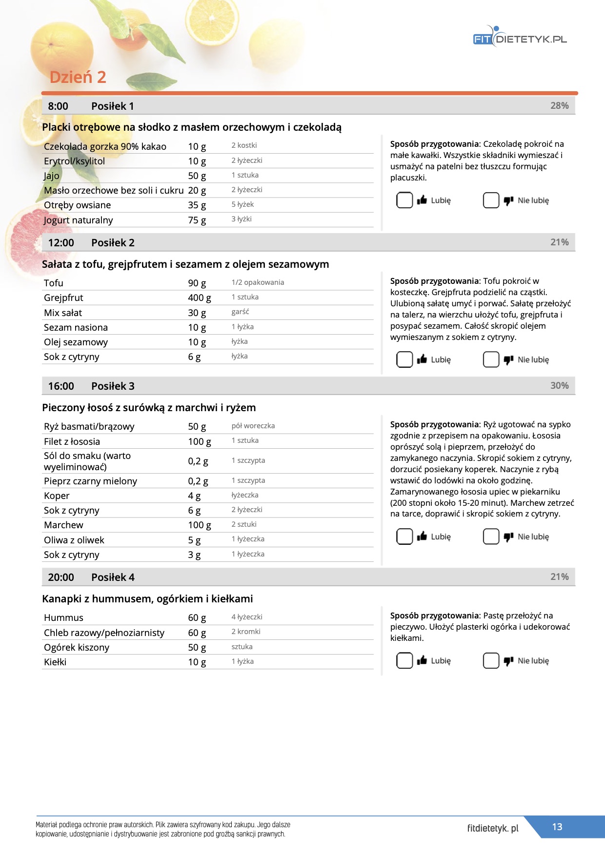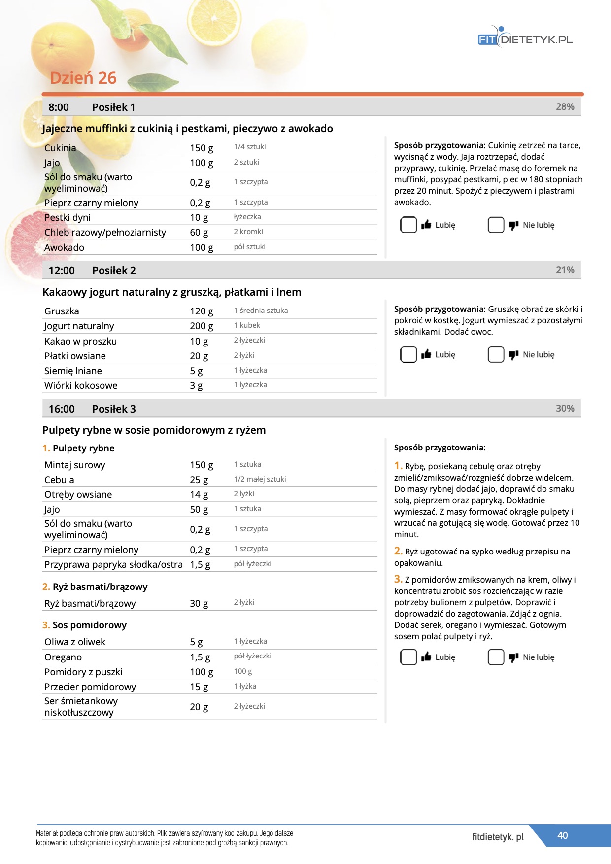 w formie propozycji posiłków (zamiast pojedynczych jadłospisów jednodniowych, przygotowano propozycje kilku propozycji dań na każdy posiłek). Tutaj nie uzależniamy Cię od tego jakie masz np. w danym dniu zjeść śniadanie czy obiad, tylko sam wybierasz sobie ulubione danie z kilku przedstawionych przez nas propozycji.