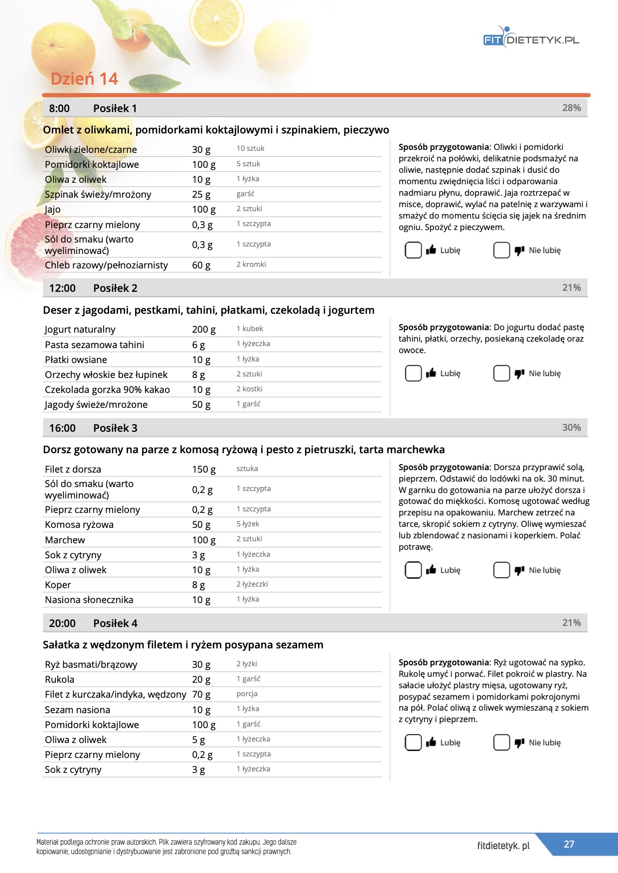 w formie precyzyjnych jadłospisów wielodniowych (na każdy dzień miesiąca jest opracowany osobny jadłospis). Tutaj nie musisz zastanawiać się co zjeść każdego dnia, gdyż będziesz mieć dokładnie wszystko rozplanowane.