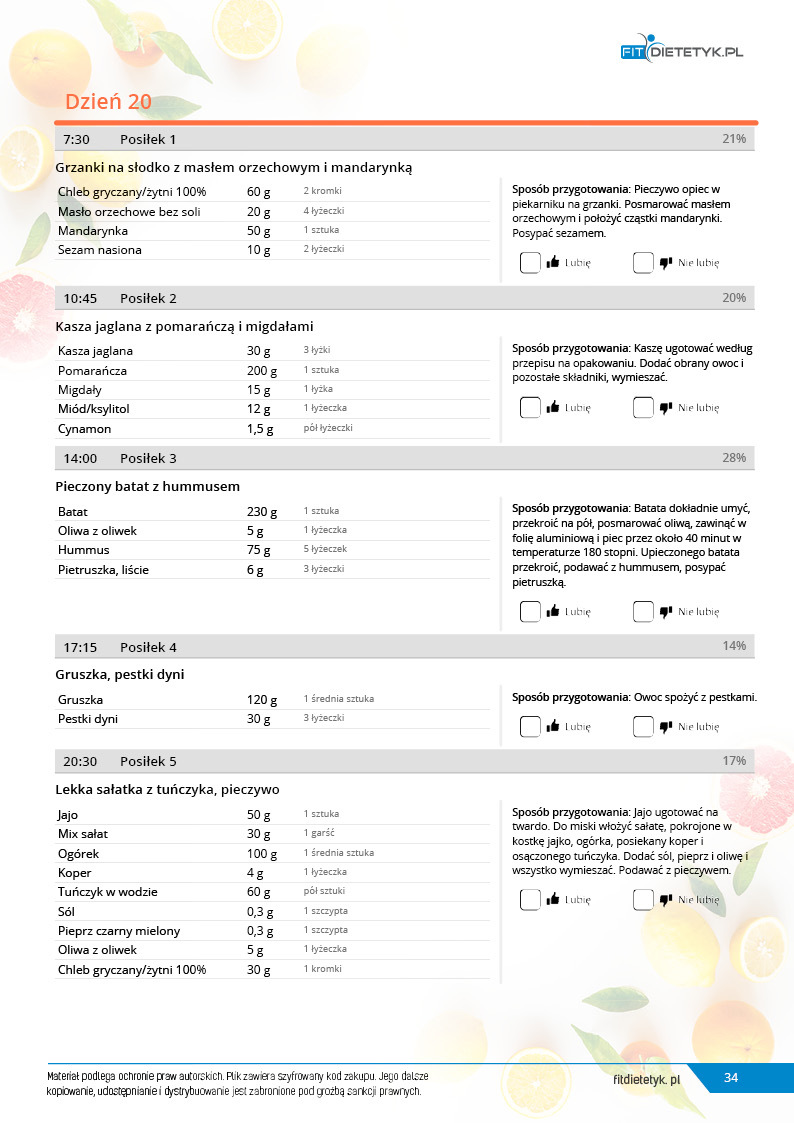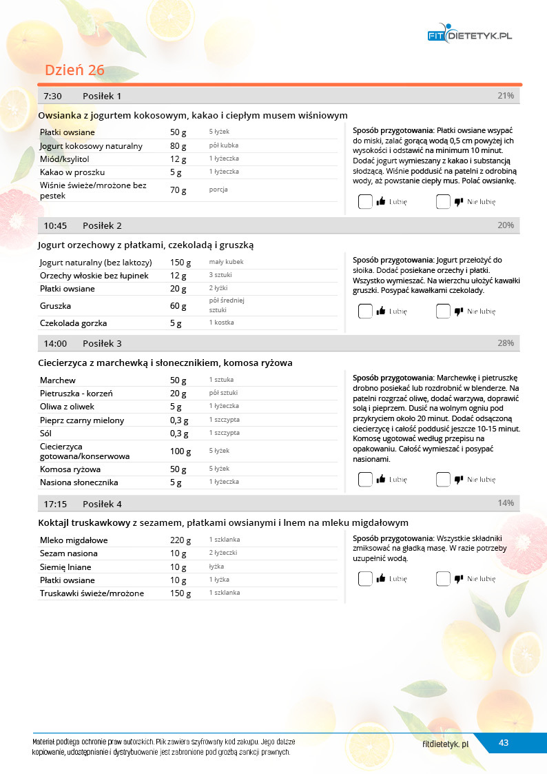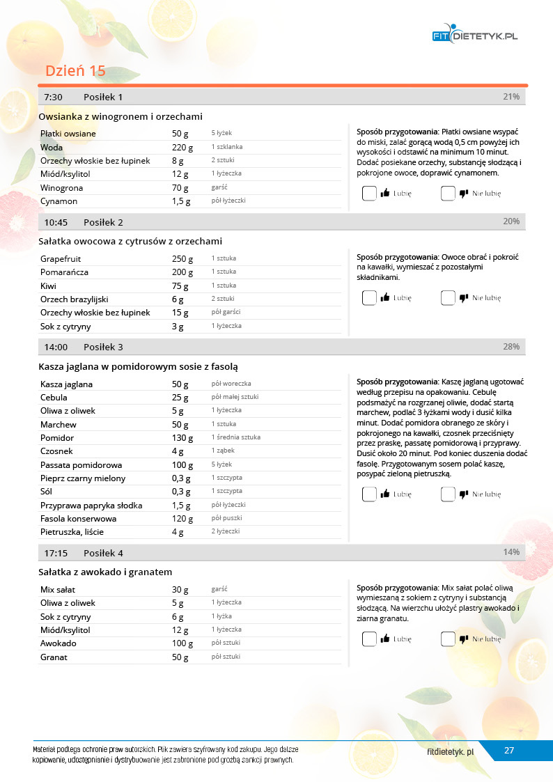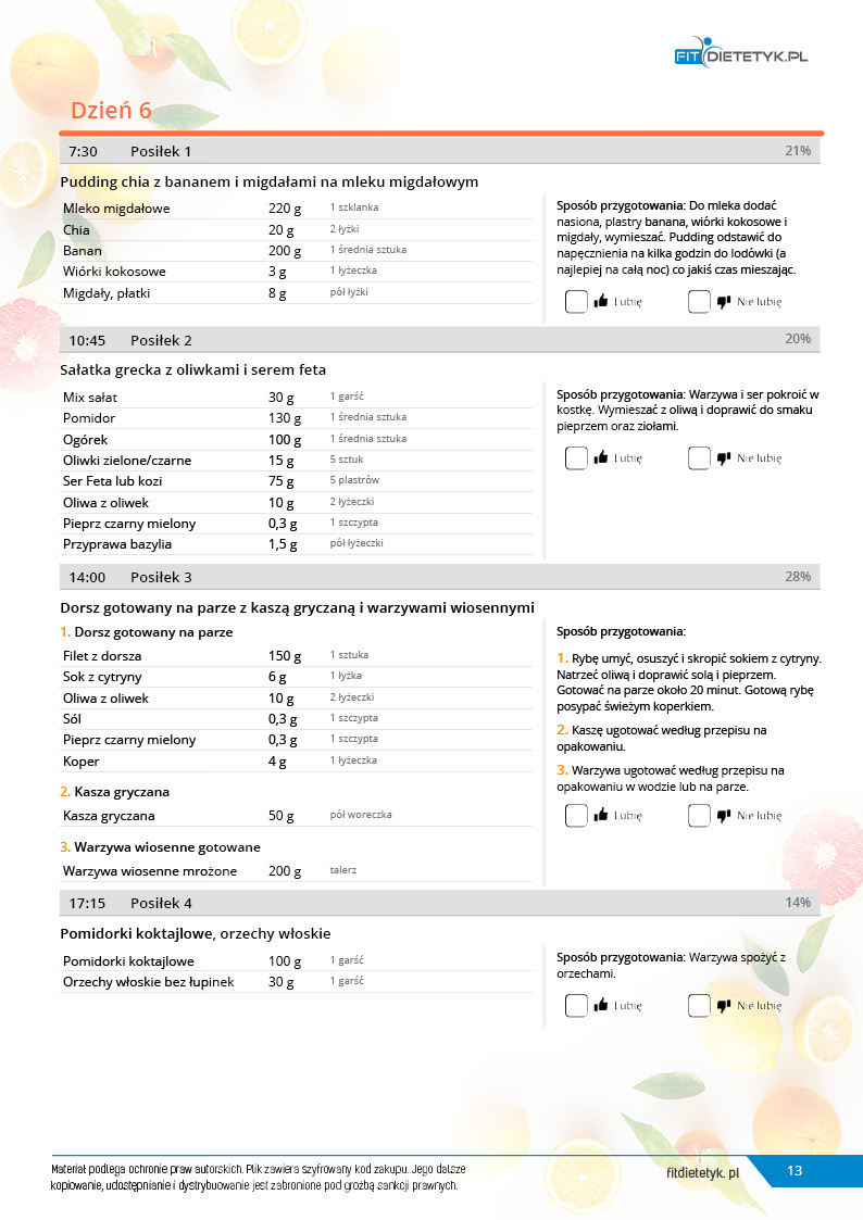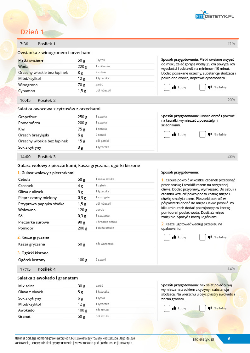 w formie propozycji posiłków (zamiast pojedynczych jadłospisów jednodniowych, przygotowano propozycje kilku propozycji dań na każdy posiłek). Tutaj nie uzależniamy Cię od tego jakie masz np. w danym dniu zjeść śniadanie czy obiad, tylko sam wybierasz sobie ulubione danie z kilku przedstawionych przez nas propozycji.