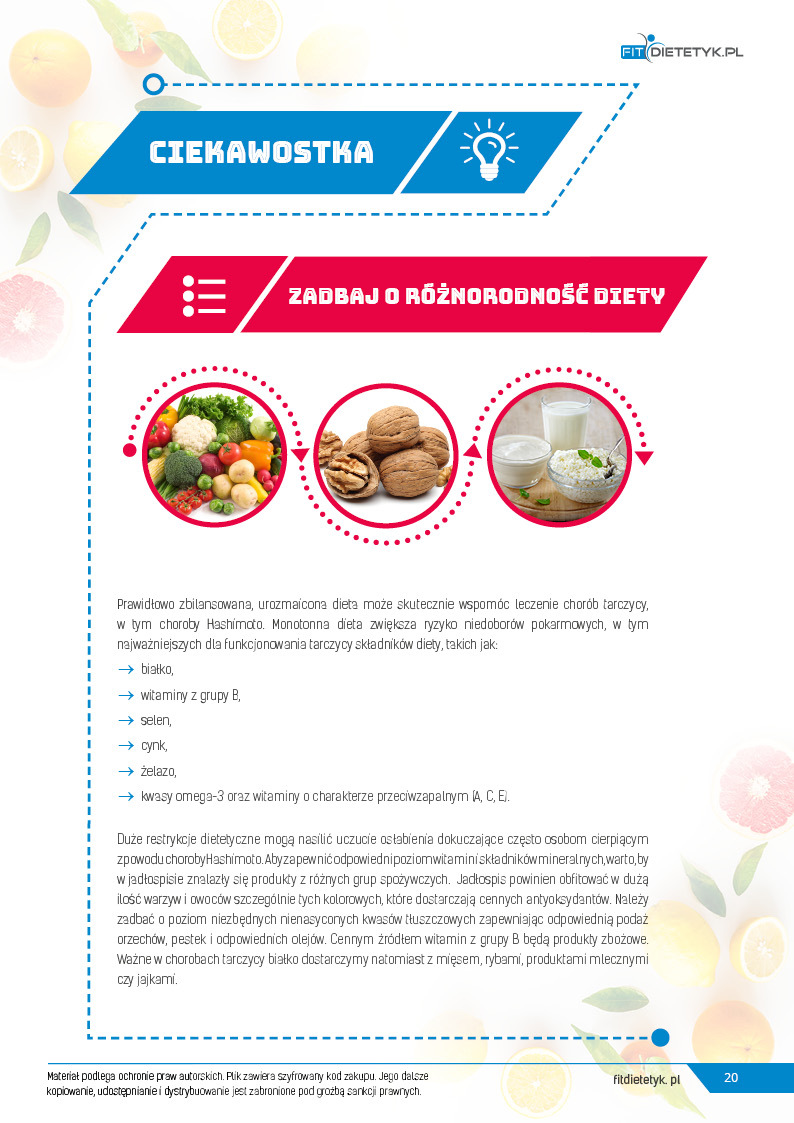 Kompleksowy program żywieniowy dla KOBIET z występującym zapaleniem tarczycy Hasimoto. Jadłospis opracowany został na 30 dni z myślą o wsparciu pracy tarczycy oraz redukcji masy ciała. Dieta nie zawiera pszenicy oraz laktozy, zawiera mniejszą ilość produktów zawierających gluten oraz produktów mlecznych. Z powodzeniem można w razie potrzeby zamienić je na produkty bezglutenowe np. pieczywo gryczane. Poprzez odpowiednie proporcje makroskładników oraz zwiększoną ilość pełnowartościowego białka dieta wspomagać może często spowolnione w wyniku zaburzeń pracy tarczycy procesy metaboliczne. Większa ilość błonnika pokarmowego zapobiega także występującym w niedoczynności zaparciom. Dodatkowo zwrócono uwagę na składniki takie jak: witaminy przeciwzapalne C i E, magnez, cynk, przeciwzapalne kwasy tłuszczowe omega-3, niezbędne nienasycone kwasy tłuszczowe oraz aminokwas tyrozynę, które mają wpływ na produkcję hormonów tarczycy.