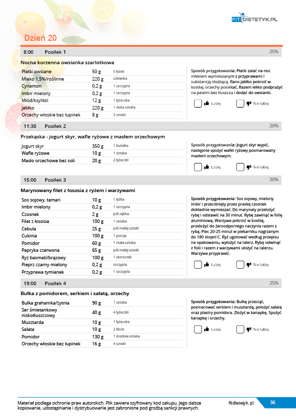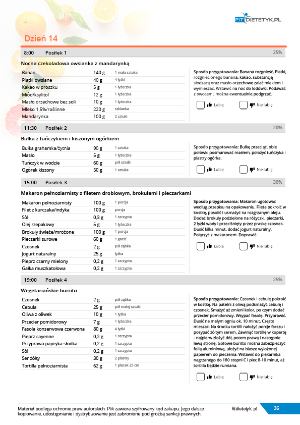 w formie propozycji posiłków (zamiast pojedynczych jadłospisów jednodniowych, przygotowano propozycje kilku propozycji dań na każdy posiłek). Tutaj nie uzależniamy Cię od tego jakie masz np. w danym dniu zjeść śniadanie czy obiad, tylko sam wybierasz sobie ulubione danie z kilku przedstawionych przez nas propozycji.