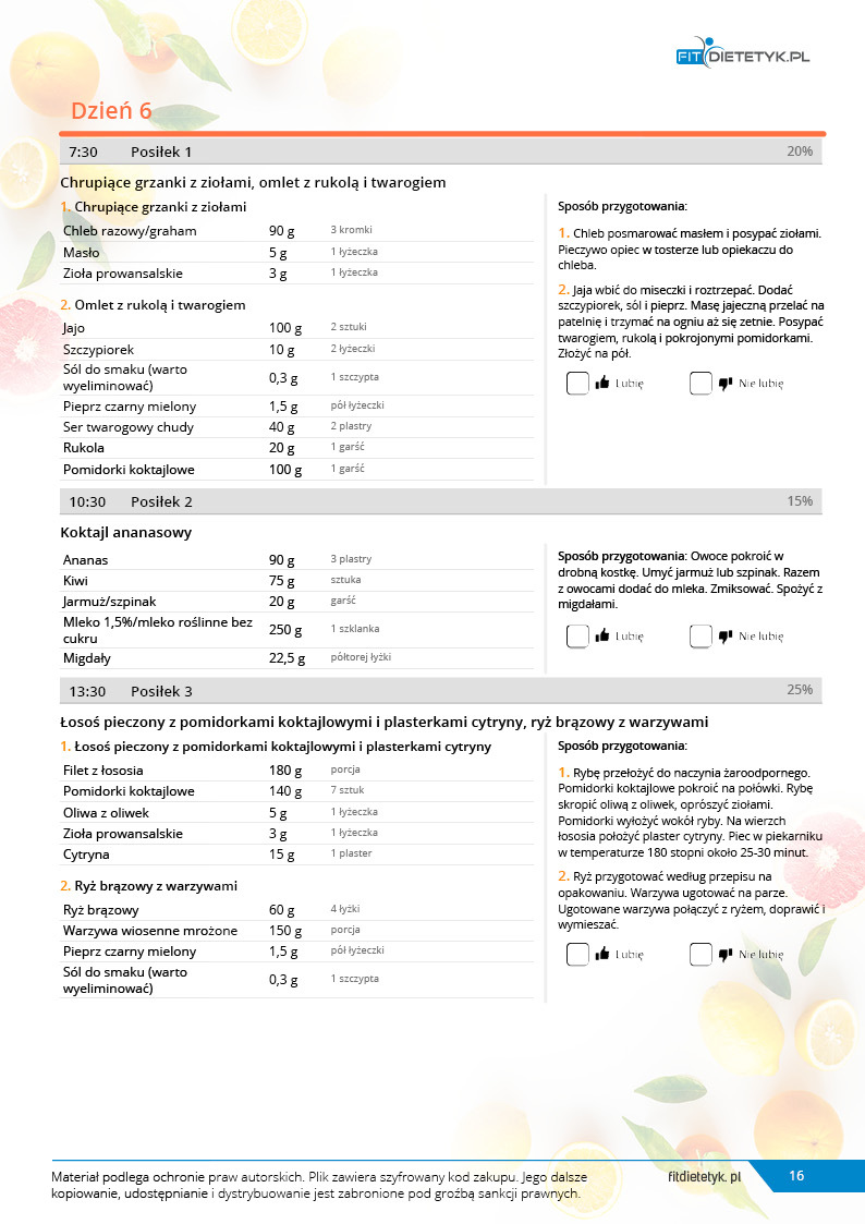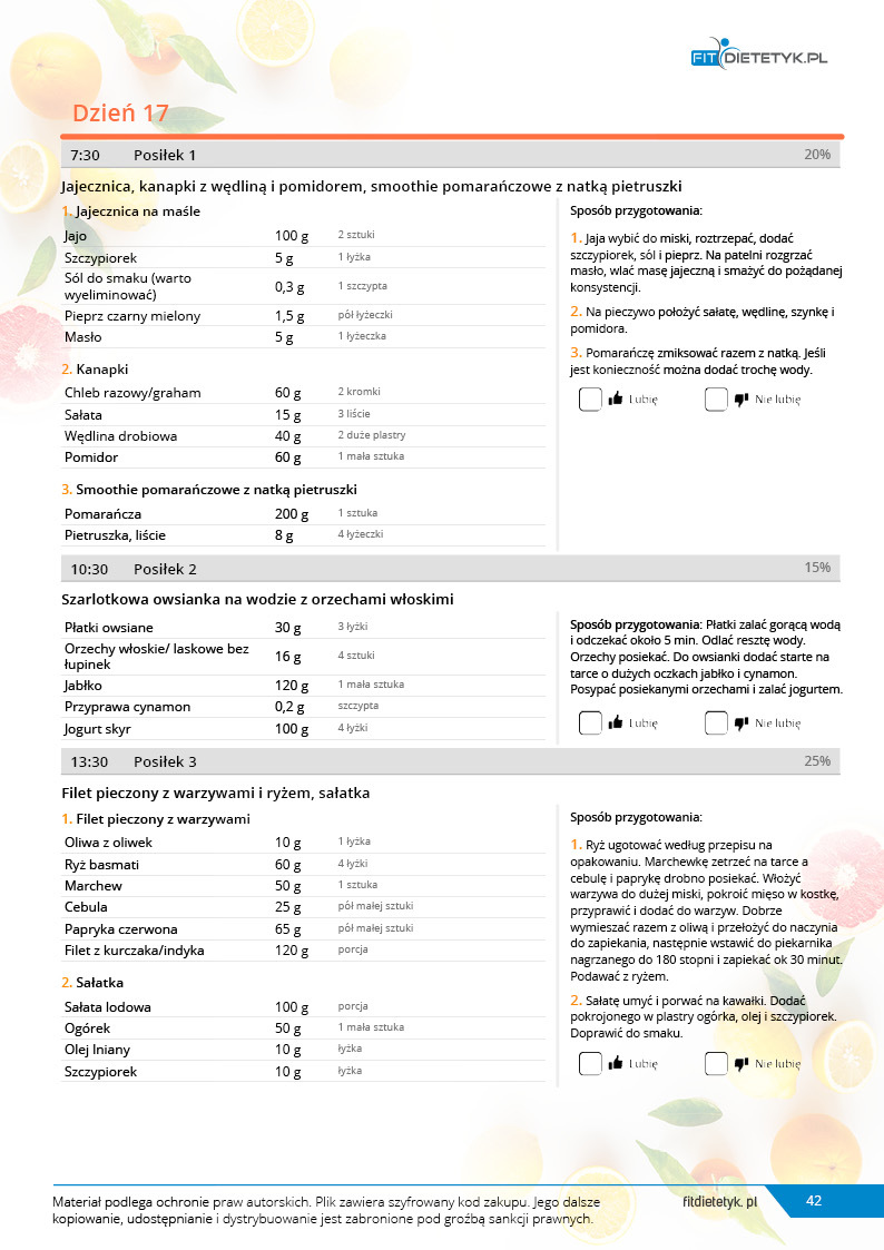 w formie propozycji posiłków (zamiast pojedynczych jadłospisów jednodniowych, przygotowano propozycje kilku propozycji dań na każdy posiłek). Tutaj nie uzależniamy Cię od tego jakie masz np. w danym dniu zjeść śniadanie czy obiad, tylko sam wybierasz sobie ulubione danie z kilku przedstawionych przez nas propozycji.