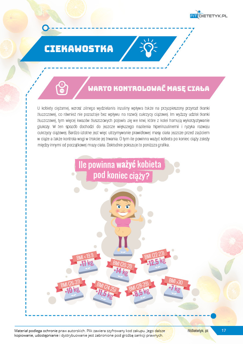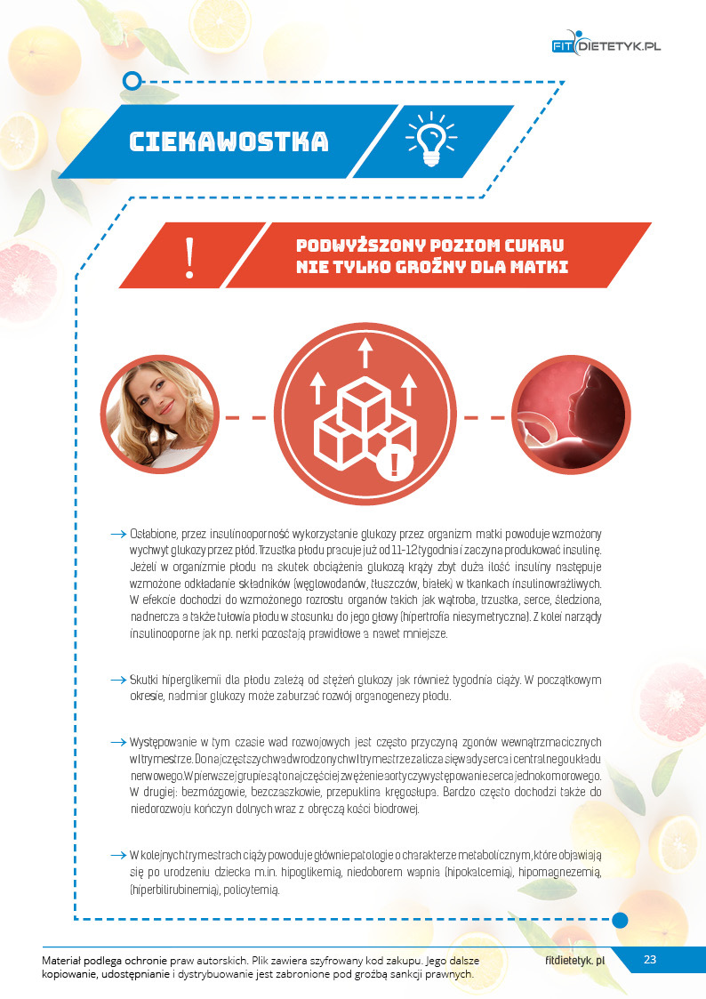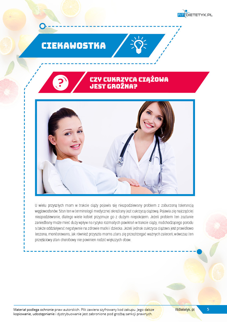 Specjalnie opracowany program żywieniowy z przeznaczeniem dla przyszłych mam borykających się z problemem cukrzycy ciążowej. Uwzględnia 30-dniowy jadłospis z 6 posiłkami w ciągu dnia. Plan żywieniowy ma za zadanie nie dopuszczać do wysokich wartości glukozy we krwi, kontrolować odpowiedni przyrost masy ciała a także zapewnić prawidłową podaż wartości odżywczych niezbędnych dla prawidłowego rozwoju dziecka. Dieta została skomponowana z produktów o niskim indeksie glikemicznym i może być stosowana przy leczeniu insuliną. Jednocześnie zwrócono uwagę na najważniejsze składniki mineralne w ciąży między innymi żelazo, cynk, wapń i foliany.