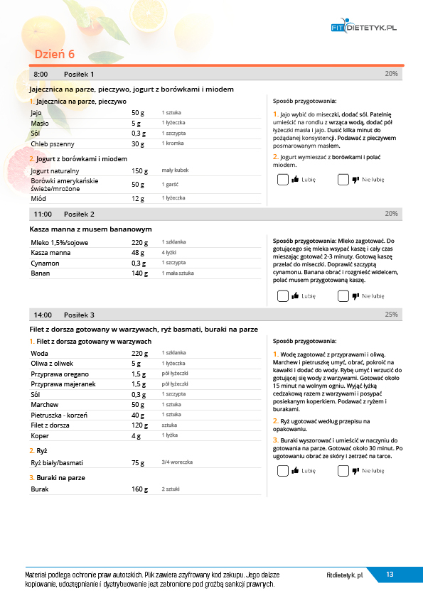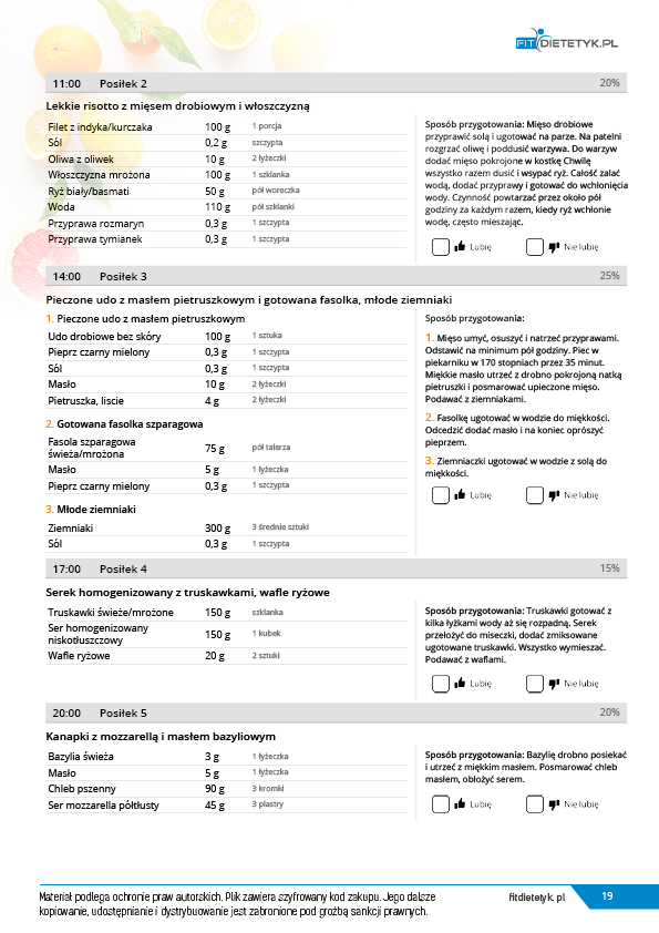 w formie propozycji posiłków (zamiast pojedynczych jadłospisów jednodniowych, przygotowano propozycje kilku propozycji dań na każdy posiłek). Tutaj nie uzależniamy Cię od tego jakie masz np. w danym dniu zjeść śniadanie czy obiad, tylko sam wybierasz sobie ulubione danie z kilku przedstawionych przez nas propozycji.