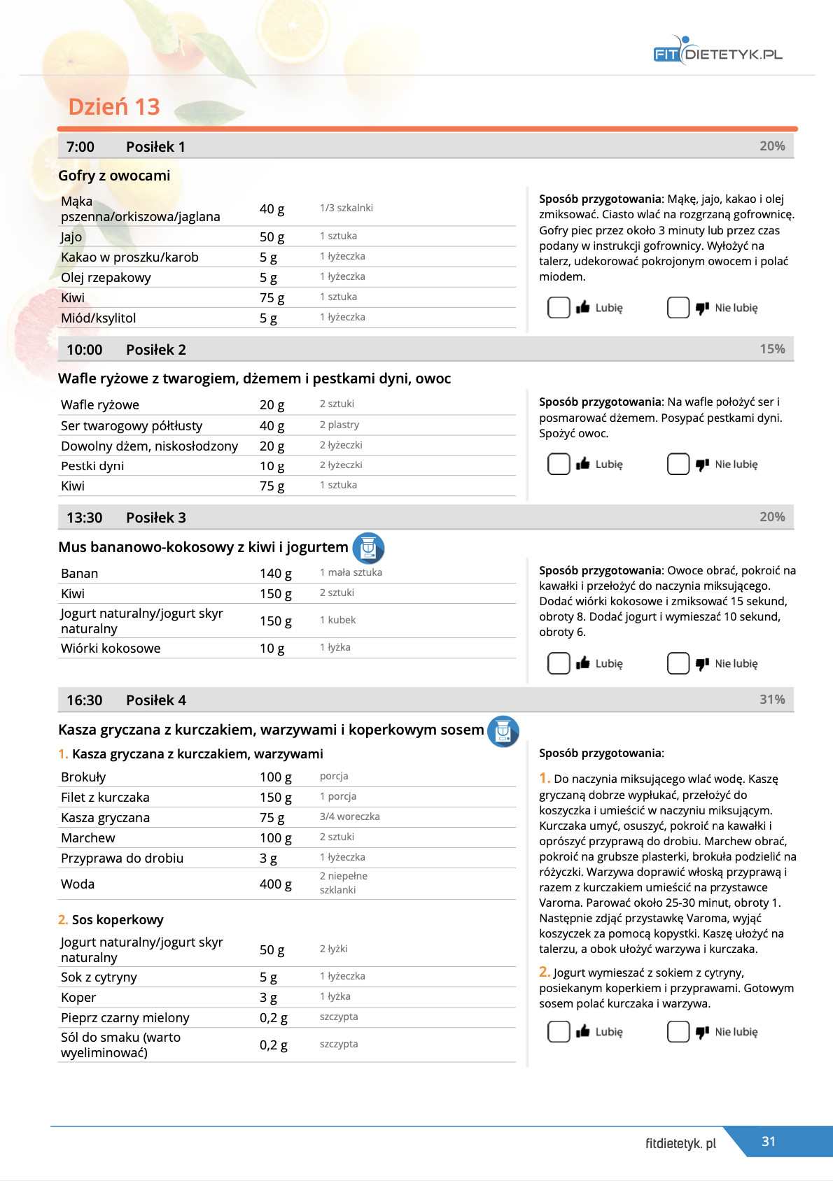 w formie propozycji posiłków (zamiast pojedynczych jadłospisów jednodniowych, przygotowano propozycje kilku propozycji dań na każdy posiłek). Tutaj nie uzależniamy Cię od tego jakie masz np. w danym dniu zjeść śniadanie czy obiad, tylko sam wybierasz sobie ulubione danie z kilku przedstawionych przez nas propozycji.