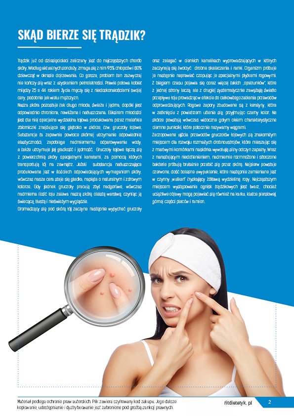 Dieta opracowana przez zespół specjalistów dietetyki klinicznej z przeznaczeniem dla osób zmagających się z problemami skóry trądzikowej. W przygotowanym programie dietetycznym zwrócono uwagę na obniżenie indeksu glikemicznego, zwiększenie podaży kwasów omega-3, odpowiednią ilość białka oraz potrzebnych witamin i minerałów wspomagających leczenie cery trądzikowej. Celem diety jest ograniczenie składników działających prozapalnie i pobudzających nadmierne wydzielanie sebum.