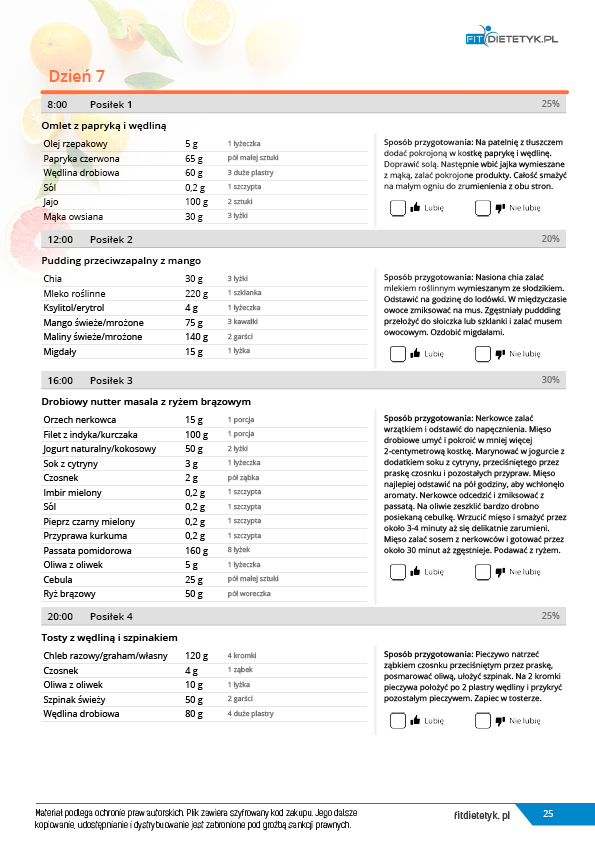 w formie propozycji posiłków (zamiast pojedynczych jadłospisów jednodniowych, przygotowano propozycje kilku propozycji dań na każdy posiłek). Tutaj nie uzależniamy Cię od tego jakie masz np. w danym dniu zjeść śniadanie czy obiad, tylko sam wybierasz sobie ulubione danie z kilku przedstawionych przez nas propozycji.