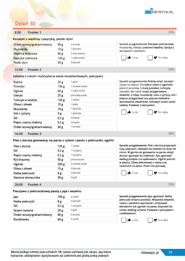 w formie precyzyjnych jadłospisów wielodniowych (na każdy dzień miesiąca jest opracowany osobny jadłospis). Tutaj nie musisz zastanawiać się co zjeść każdego dnia, gdyż będziesz mieć dokładnie wszystko rozplanowane.