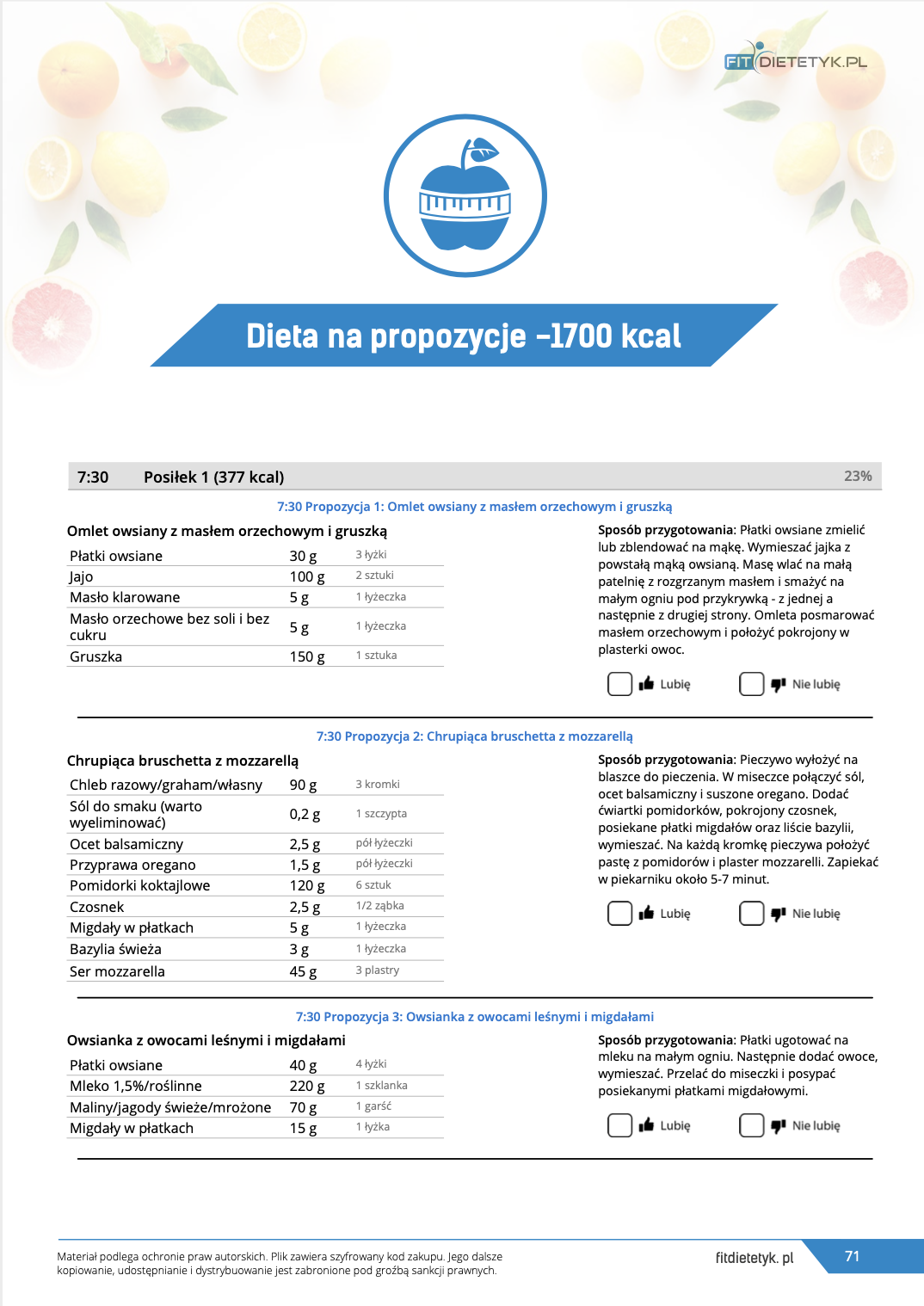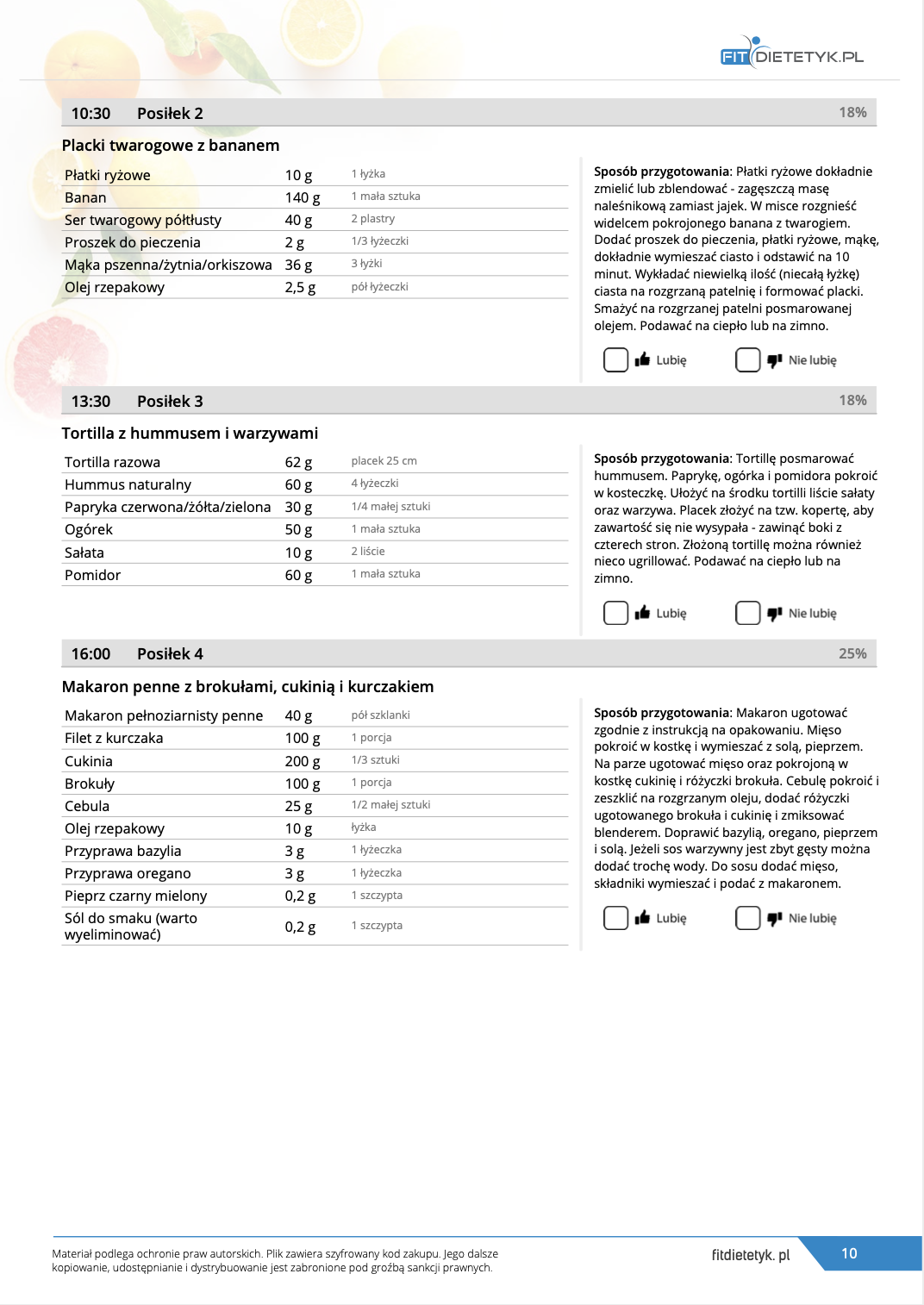 w formie propozycji posiłków (zamiast pojedynczych jadłospisów jednodniowych, przygotowano propozycje kilku propozycji dań na każdy posiłek). Tutaj nie uzależniamy Cię od tego jakie masz np. w danym dniu zjeść śniadanie czy obiad, tylko sam wybierasz sobie ulubione danie z kilku przedstawionych przez nas propozycji.