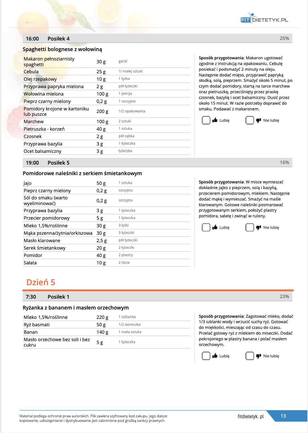 w formie precyzyjnych jadłospisów wielodniowych (na każdy dzień miesiąca jest opracowany osobny jadłospis). Tutaj nie musisz zastanawiać się co zjeść każdego dnia, gdyż będziesz mieć dokładnie wszystko rozplanowane.