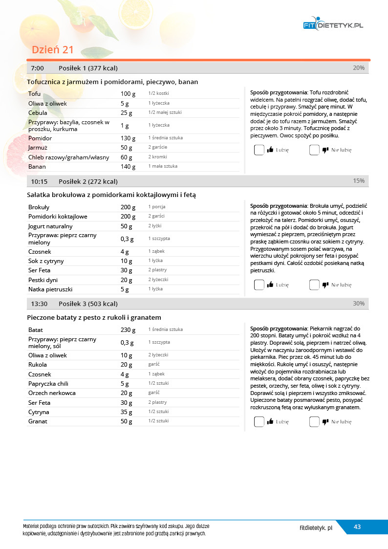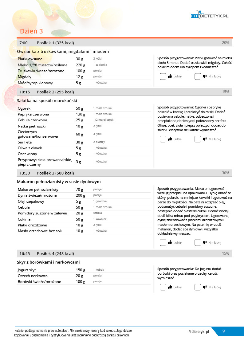 w formie propozycji posiłków (zamiast pojedynczych jadłospisów jednodniowych, przygotowano propozycje kilku propozycji dań na każdy posiłek). Tutaj nie uzależniamy Cię od tego jakie masz np. w danym dniu zjeść śniadanie czy obiad, tylko sam wybierasz sobie ulubione danie z kilku przedstawionych przez nas propozycji.