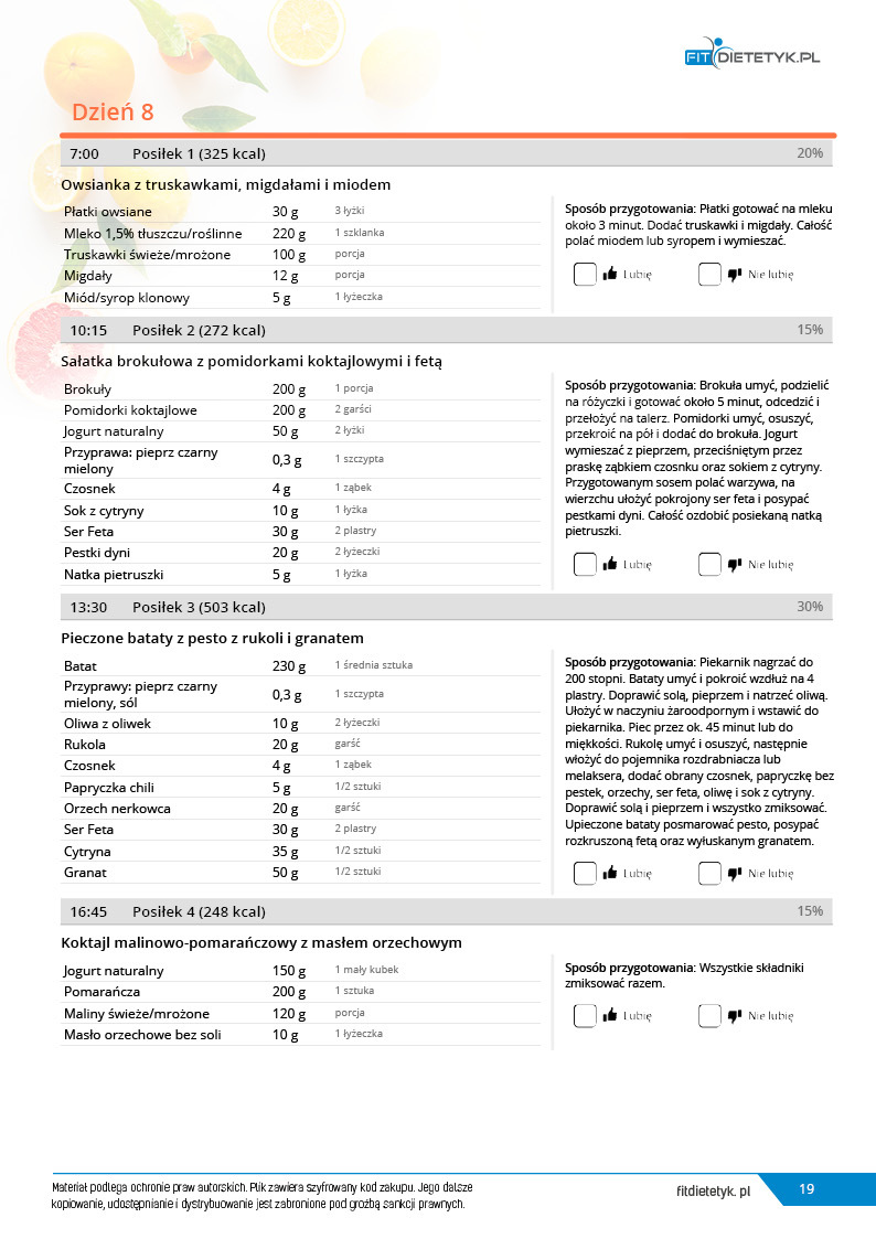w formie precyzyjnych jadłospisów wielodniowych (na każdy dzień miesiąca jest opracowany osobny jadłospis). Tutaj nie musisz zastanawiać się co zjeść każdego dnia, gdyż będziesz mieć dokładnie wszystko rozplanowane.