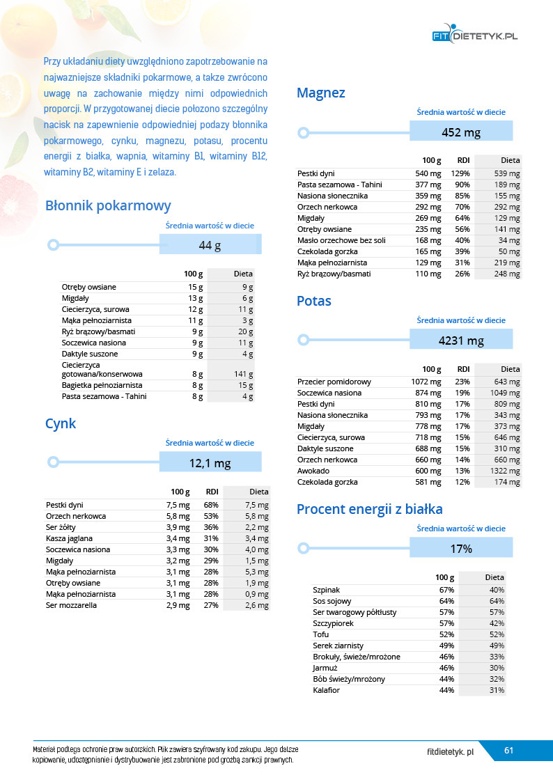 Kompleksowy, 30 dniowy program dietetyczny opracowany specjalnie dla KOBIET praktykujących lub chcących praktykować WEGETARIANIZM. Jadłospis oparto o produkty pochodzenia roślinnego z niewielkim dodatkiem produktów mlecznych o dużej zawartości białka. Dieta została skomponowana przez zespół dietetyków specjalizujących się w tematyce diety wegetariańskiej. Ta bardzo urozmaicona, niezwykle pożywna i wyjątkowo smaczna dieta zadowoli każdego, kto szuka zdrowych i wartościowych dań wegetariańskich. Pod względem odżywczym w diecie położono w szczególności nacisk na podaż takich składników jak białko, żelazo, witaminy grupy B oraz wiele minerałów których często brakuje w dietach roślinnych. Dieta idealnie nadaje się dla osób, chcących też spróbować takiego modelu żywienia.