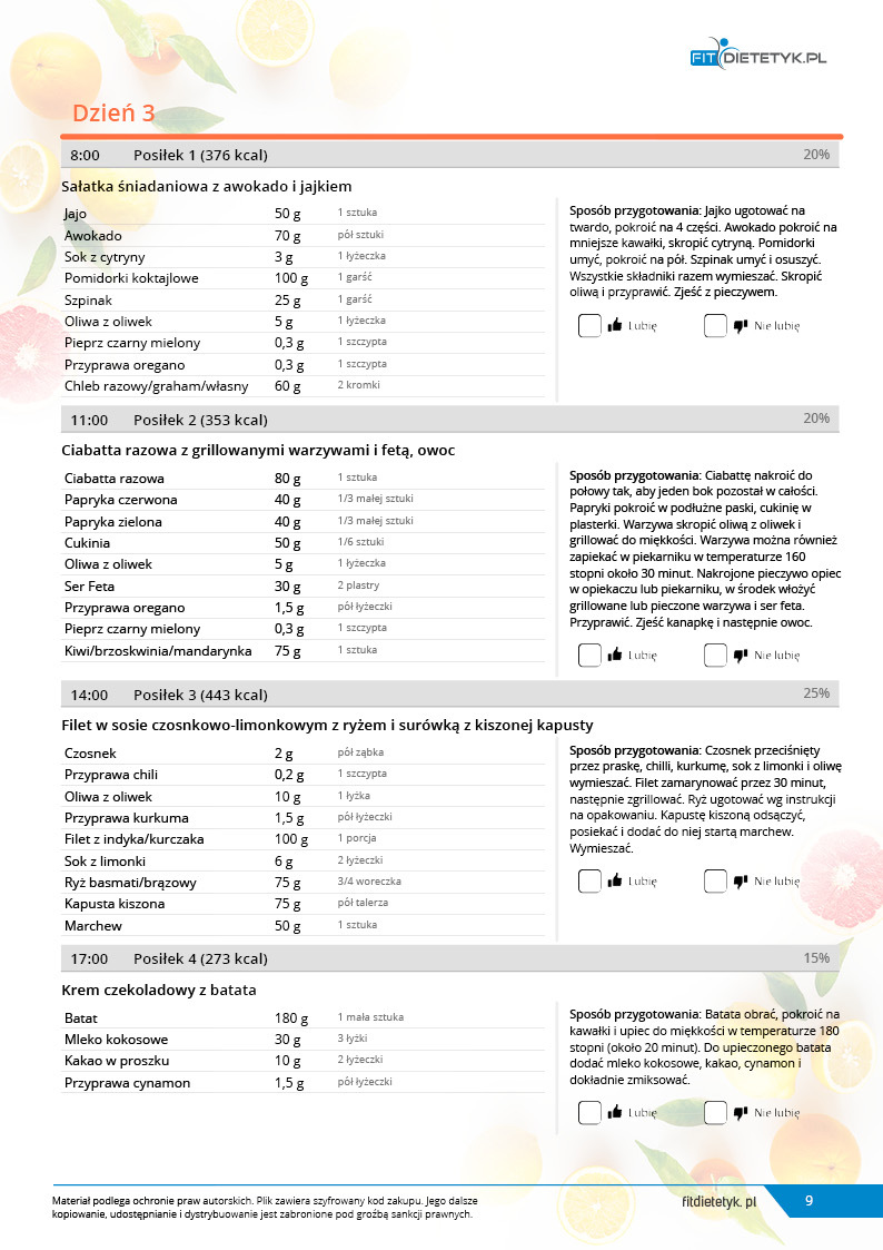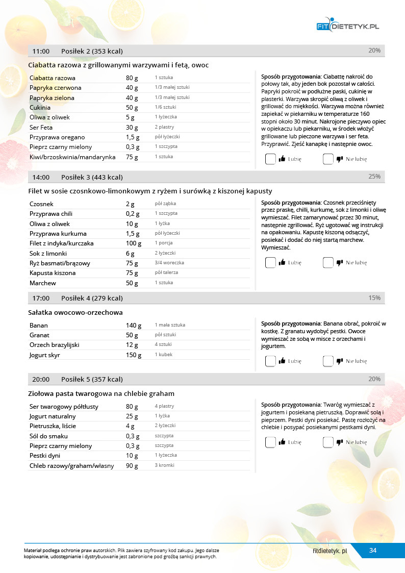 w formie propozycji posiłków (zamiast pojedynczych jadłospisów jednodniowych, przygotowano propozycje kilku propozycji dań na każdy posiłek). Tutaj nie uzależniamy Cię od tego jakie masz np. w danym dniu zjeść śniadanie czy obiad, tylko sam wybierasz sobie ulubione danie z kilku przedstawionych przez nas propozycji.