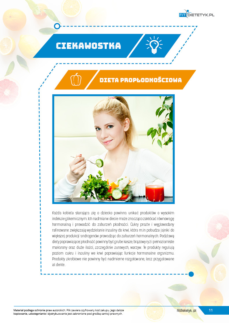 Ten wyjątkowy 30-dniowy program dietetyczny został specjalnie opracowany przez zespół dietetyków dla kobiet planujących ciążę. Jest to dieta przygotowana w celu poprawienia płodności oparta na żywności naturalnej, niskoprzetworzonej, bogatej w składniki pokarmowe potrzebne do osiągnięcia równowagi hormonalnej, funkcji reprodukcyjnych i późniejszego, prawidłowego rozwoju płodu. Jest to dieta bardzo pomocna w zrównoważeniu istniejących problemów z płodnością oraz zgromadzeniu zapasów składników odżywczych. W diecie położono szczególny nacisk m.in. na: odpowiednią podaż pełnowartościowego białka, wymaganych kwasów tłuszczowych, wysoką zawartość żelaza, folianów, witaminy B12, cynku i wielu innych składników odżywczych.