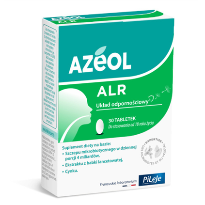 Suplement diety na bazie tyndalizowanego szczepu mikrobiotycznego Latilactobacillus sakei LA907 w dziennej porcji 4 miliardów w tabletce, ekstraktu z babki lancetowatej i cynku. Zmieniające się pory roku mogą znacznie obciążyć układ odpornościowy. Tabletki Azeol ALR łączą w sobie dwa obszary specjalistycznej wiedzy laboratorium PiLeJe: wiedzę na temat mikrobioty i wiedzę na temat roślin. Tyndalizowany szczep mikrobiotyczny i ekstrakt z babki lancetowatej zostały rygorystycznie wyselekcjonowane i tworzą wyjątkowe połączenie. Cynk przyczynia się do prawidłowego funkcjonowania układu odpornościowego. Przeciwwskazania: niewskazany u kobiet w ciąży lub karmiących oraz dzieci. Nie przekraczać zalecanej porcji do spożycia w ciągu dnia.Rekomendowany do suplementacji w: