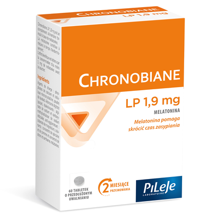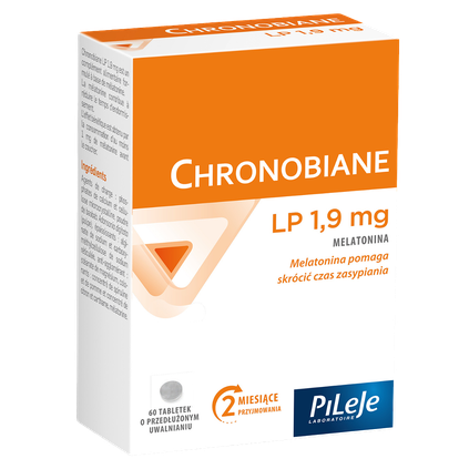 Chronobiane LP 1,9 mg to suplement diety w formie tabletek o przedłużonym uwalnianiu na bazie melatoniny. Melatonina pomaga skrócić czas zasypiania. Przeciwwskazania: może być podawany tylko dzieciom i młodzieży na podstawie porady lekarskiej. Niezalecany dla kobiet w ciąży i / lub karmiących piersią. W połączeniu z leczeniem farmakologicznym należy zasięgnąć porady lekarza lub farmaceuty.Rekomendowany do suplementacji w: