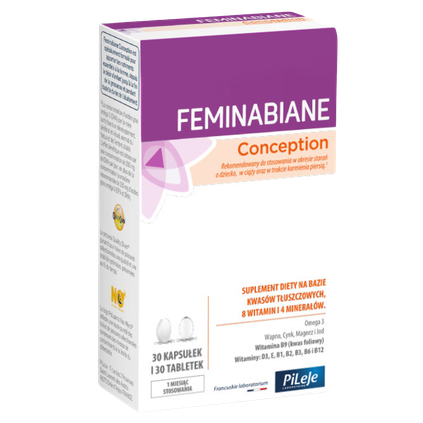 Feminabiane Conception jest specjalnie opracowanym suplementem diety dostarczającym składniki odżywcze niezbędne dla organizmu kobiety w okresie starań o dziecko, w trakcie ciąży aż do zakończenia karmienia dziecka piersią. Suplement diety na bazie kwasów tłuszczowych Omega 3, 8 witamin oraz 4 minerałów.Rekomendowany do suplementacji w: